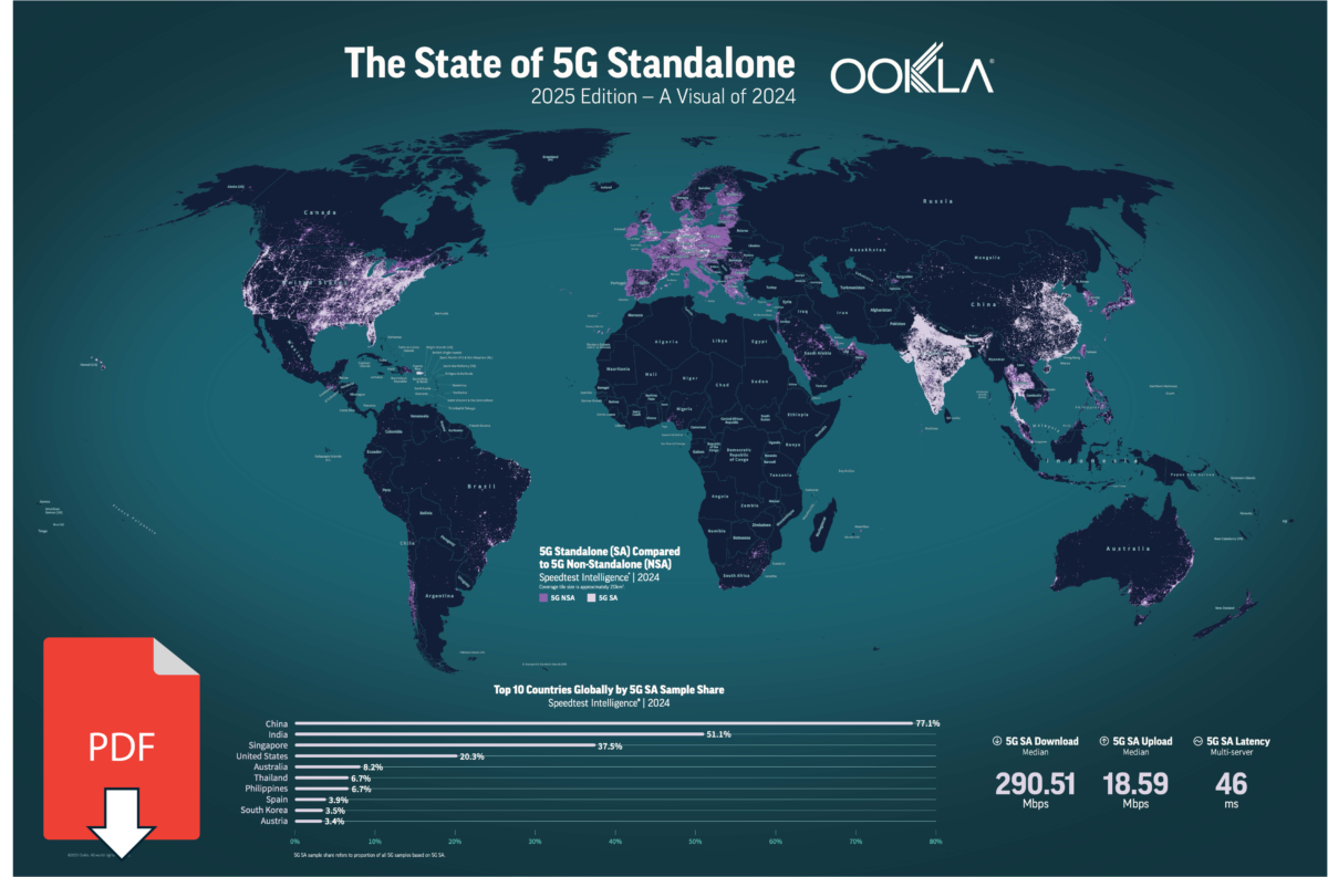 For the first time, and with the goal of offering deeper insight into the state of 5G SA worldwide, Ookla® has created a high-resolution downloadable poster based on Speedtest Intelligence® data, providing a unified view of the global reach of both 5G NSA and 5G SA networks in 2024. This visual is part of a flagship global study in collaboration with Omdia, comparing the competitiveness of leading regions and countries in 5G SA deployment, performance, and monetization.