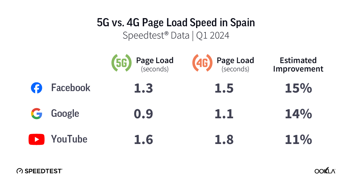 5G page load speed in Spain was somewhat faster than 4G on all three services during Q1 2024. YouTube loaded 11% faster on 5G than 4G, Google was 14% faster than 4G, and Facebook was 15% faster on 5G.