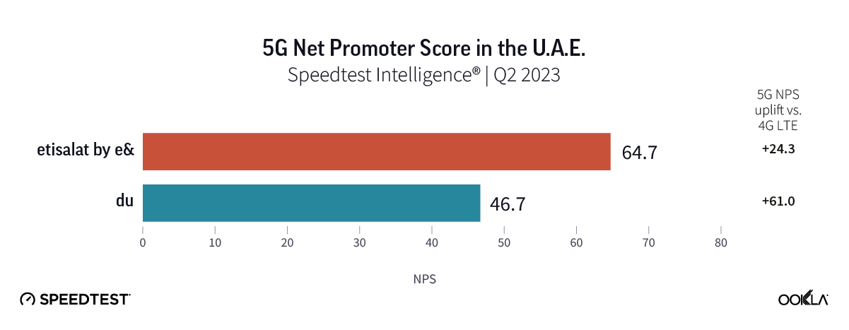 Ookla’s Speedtest Intelligence data showed that du’s 5G service recorded the largest difference in NPS when comparing users on its 4G LTE network to those on 5G during Q2 2023, with an uplift of 61.0 basis points to reach 46.7. etisalat by e& recorded the higher NPS scores on its 5G network, of 64.7, while its 4G LTE NPS score of 40.4 was equally impressive.