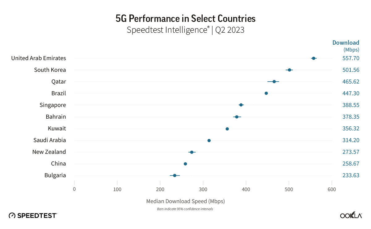 The U.A.E. was the fastest 5G market globally in Q2 2023, according to Ookla Speedtest Intelligence data, recording a median download speed of 557.63 Mbps, with South Korea placing second at 501.56 Mbps.