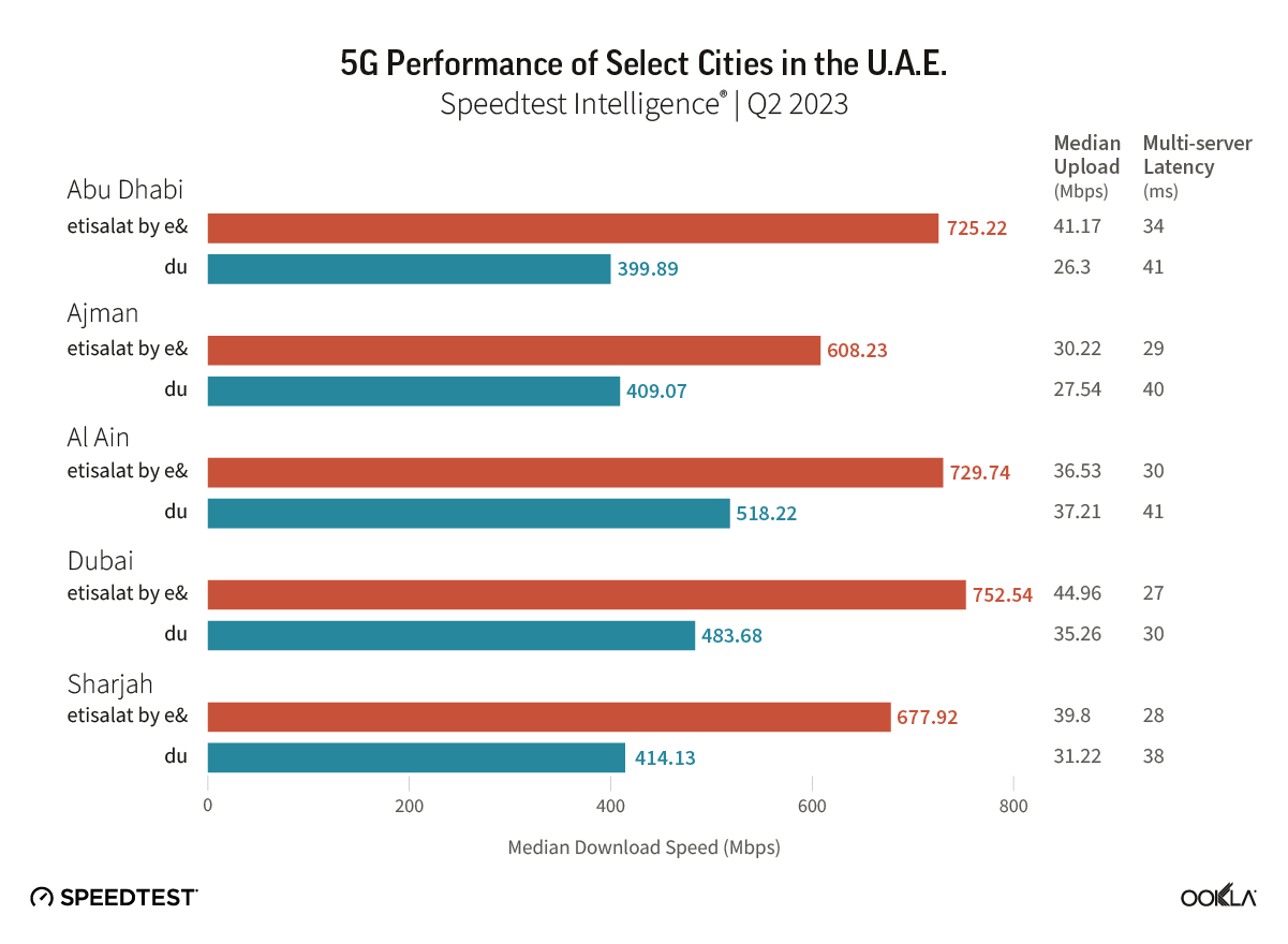 - Top-performing global 5G market and network operator. The U.A.E. was the fastest 5G market globally in Q2 2023 according to OoklaⓇ Speedtest IntelligenceⓇ data, with growing competition between the nation’s two network operators helping to drive overall performance in the market to reach a median download speed of 557.63 Mbps. etisalat by e& was the fastest 5G operator globally with a median download speed of 680.73 Mbps.