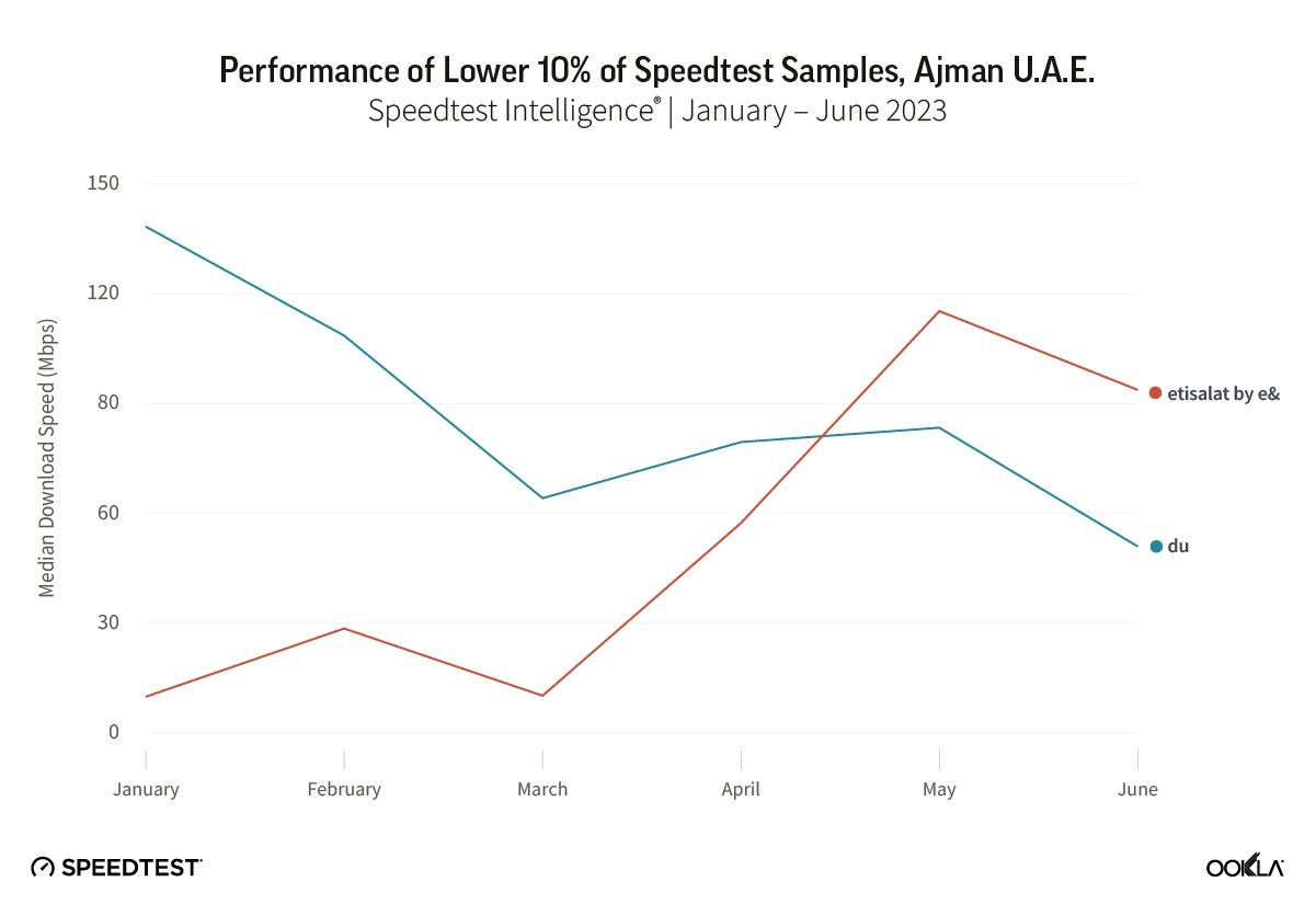 du and etisalat by e& both performed strongly on 5G Consistency, with scores of 92.1% and 90.9% respectively. Drilling down into the city-level data, and looking at performance for the lowest 10% of samples, reveals some potential improvement points for both operators. For the city of Ajman, etisalat by e& has recorded a significant improvement in the lower 10th percentile of 5G samples, increasing from 9.76 Mbps in January to 93.67 Mbps in June. However despite the increase, its performance in Ajman remains below that recorded in other U.A.E. cities. du on the other hand has returned more stable 5G performance among the lower 10% of samples in the city over the past six months, but is seeing performance decline, from 138.33 Mbps in January to 50.85 Mbps in June.