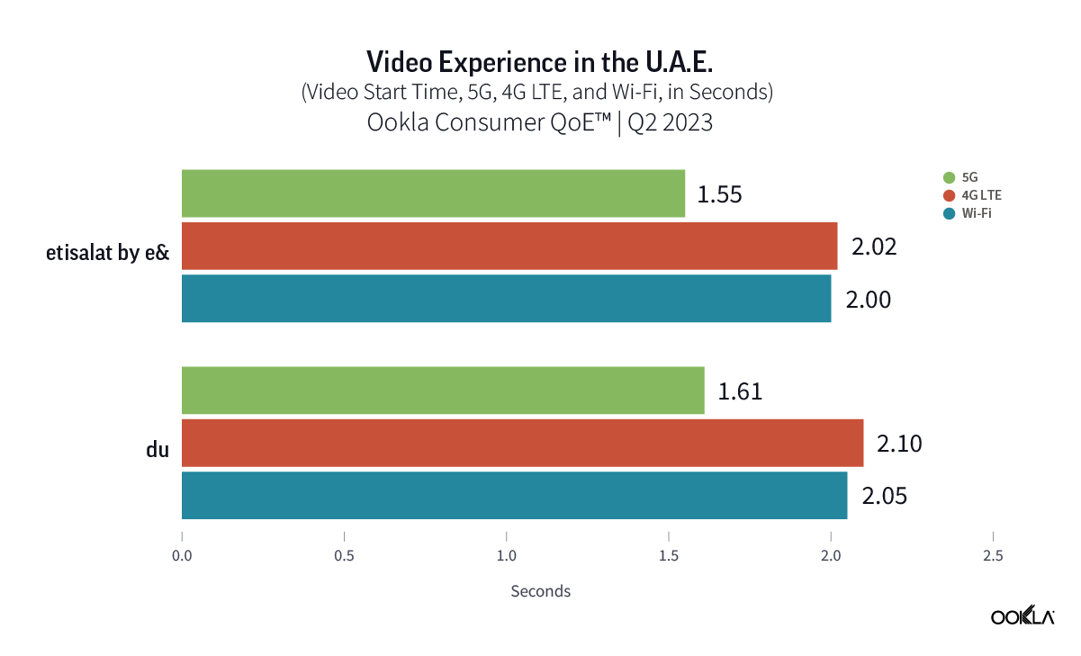 - 5G networks trump 4G-LTE for mobile gaming and video streaming experiences. Users accessing both etisalat by e&’s and du’s 5G networks experienced median gaming latency of 43 ms and 57 ms respectively, lower than those recorded across 4G LTE. 5G users also experienced improved video start times and experienced less buffering when streaming video compared to those on either 4G LTE or Wi-Fi.