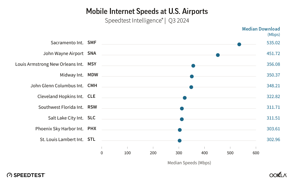Speedtest Intelligence® shows Sacramento International Airport and John Wayne Airport were the fastest airports on our list for mobile download speed during Q4 2024 at 535.02 Mbps and 451.72 Mbps, respectively. In all, 24 airports in our study had median download speeds over 150 Mbps, up from 18 in 2023. Fifteen of the airports showed median download speeds over 200 Mbps in 2024.