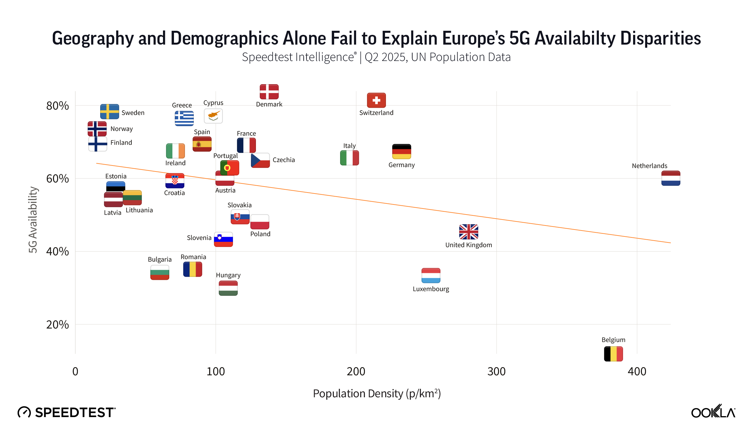 Fragmentation remains a persistent theme, shaping stark 5G deployment asymmetries that cannot be explained by geography or demographics alone. Northern and Southern European countries such as Denmark (83.9%), Sweden (77.8%), and Greece (76.4%) are disproportionately represented among the countries with the highest 5G Availability in Q2 2025, with coverage rates up to twice as high as those in Western and Eastern countries like the United Kingdom (45.2%), Hungary (29.9%), and Belgium (11.9%).