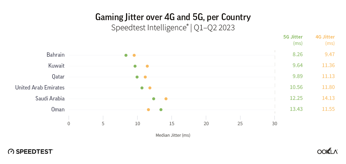 Results show that the Gulf region has low jitter, especially on 5G. Jitter ranged from 8.26 ms in Bahrain to 13.43 ms in Oman during Q1-Q2 2023. Jitter on 4G was slightly higher than 5G in all countries except in Oman where it was surprisingly lower at 11.55 ms – both Ooredoo and Omantel recorded lower jitter on their 4G network than on 5G during the first half of 2023.