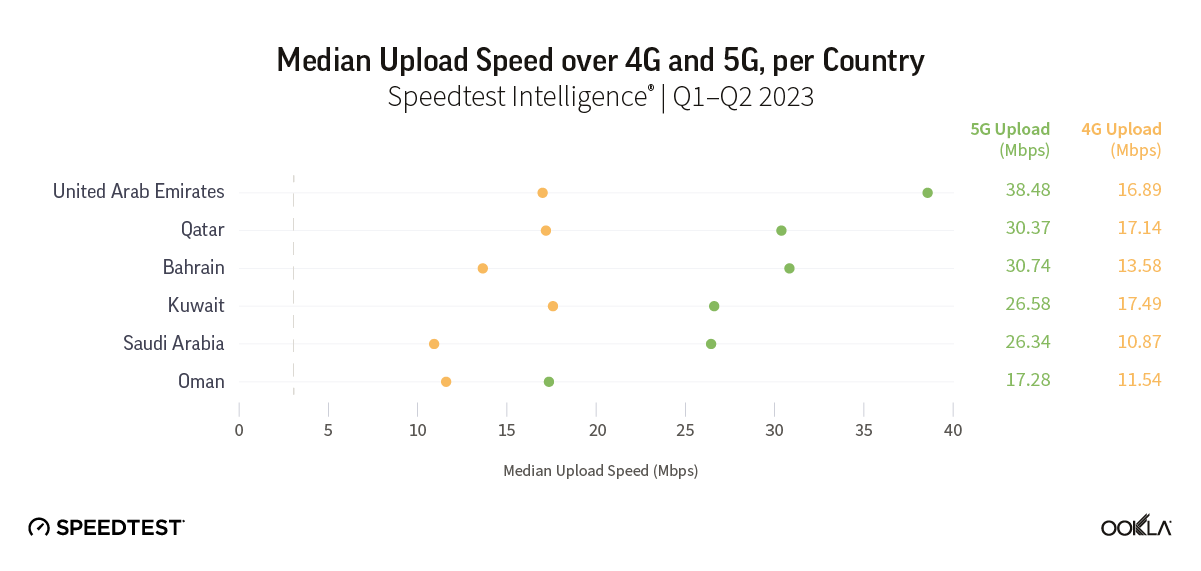 Ookla’s data shows that Gulf markets are crushing it when it comes to exceeding upload requirements for both 4G and 5G. The lowest median upload speed recorded on 4G was in Saudi Arabia at 10.87 Mbps; For 5G, it was in Oman at 17.28 Mbps. Median upload speeds on 5G were 1.27X faster than those on a 4G network in the region. The gap between 4G and 5G upload speeds is larger in Bahrain, Saudi Arabia, and the U.A.E., which means that gamers in these countries could see the most significant improvement in gameplay and streaming quality when switching from 4G to 5G. In absolute terms, Qatar, Bahrain, and the U.A.E. offer the fastest upload speeds, reaching a maximum of 38.48 Mbps for the latter.