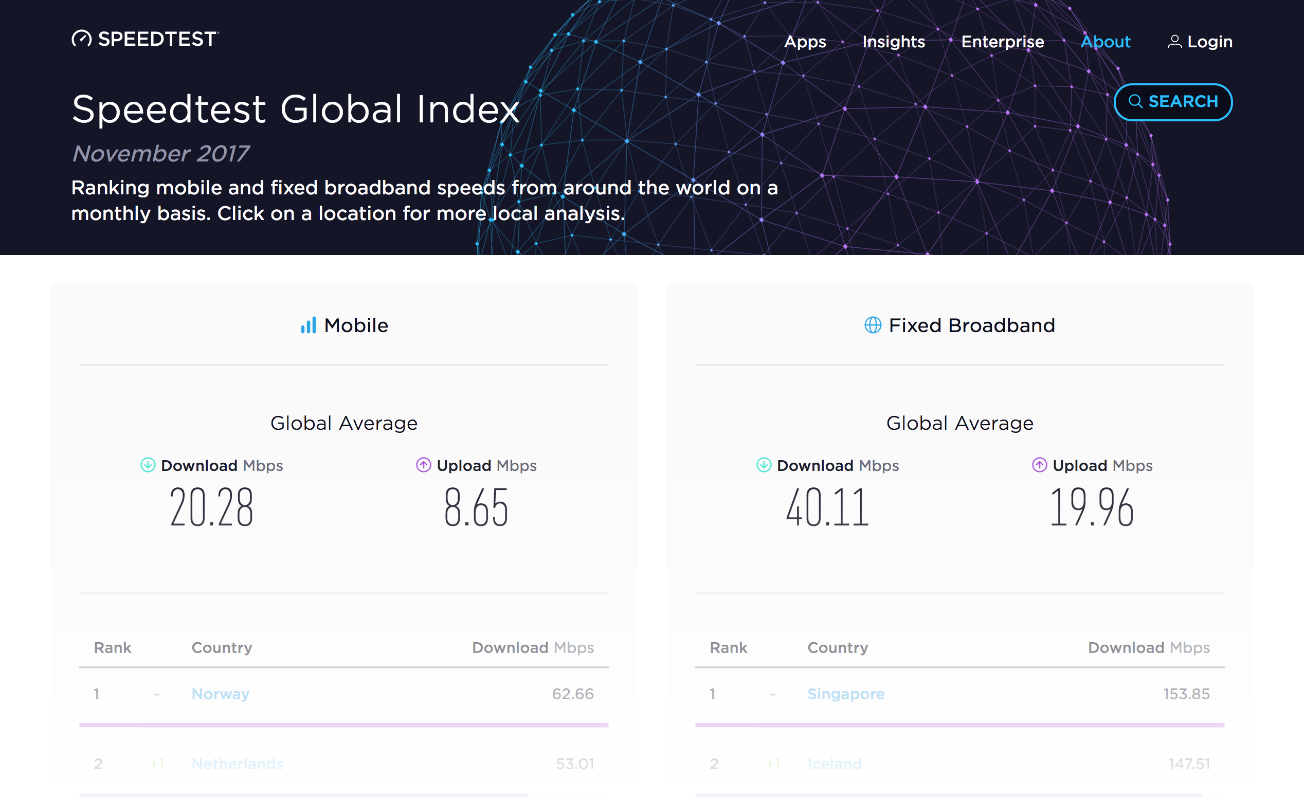 We’ll revisit global internet speeds periodically here on our blog, but you can keep up to date on the latest trends in worldwide internet speeds by visiting the Speedtest Global Index. It’s updated every month with individual country data and, now, global averages. Keep track of your country’s performance and see how you rank against the world.
