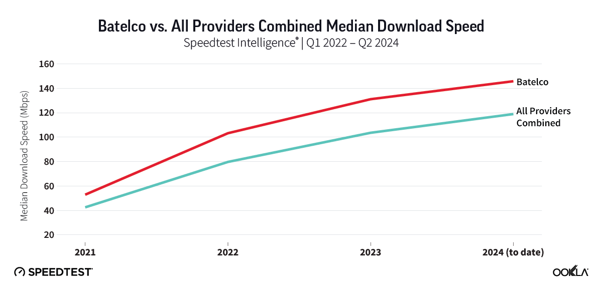 Batelco has improved overall download speeds, 4G download speeds, and 5G download speeds significantly over the past year.