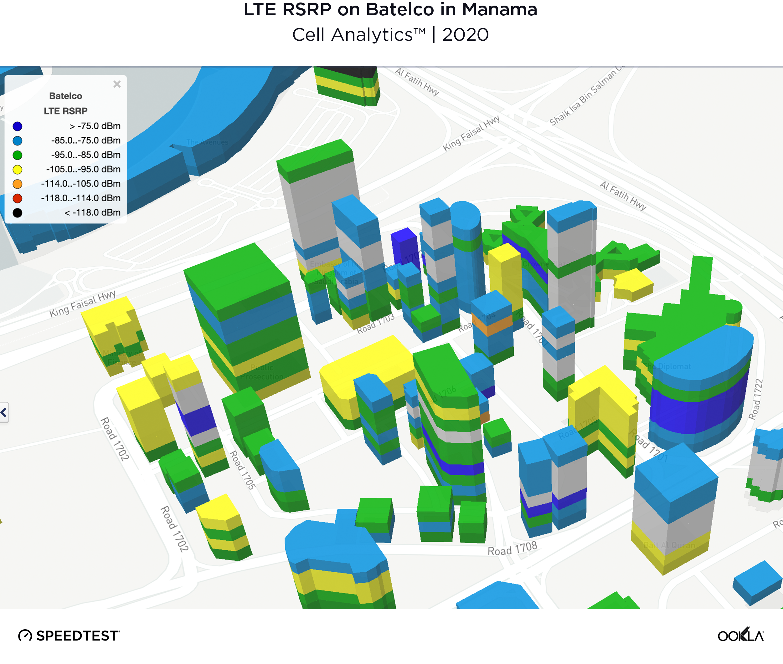 Indoor coverage is incredibly important in Bahrain where there are, on average, 10 or more devices per household. Because indoor service issues can sometimes be limited to specific floor groups in tall buildings, it is especially important to have insight into RF conditions by building height and intelligence about indoor vs. outdoor network performance. Batelco used Cell Analytics 3D maps to determine the altitudes at which users experience poor network quality or throughput. As a result of these improvements, we can see in the image below that throughout 2020, even the highest floors of the tallest buildings in the capital city of Manama experienced good to excellent signal strength on the Batelco network.