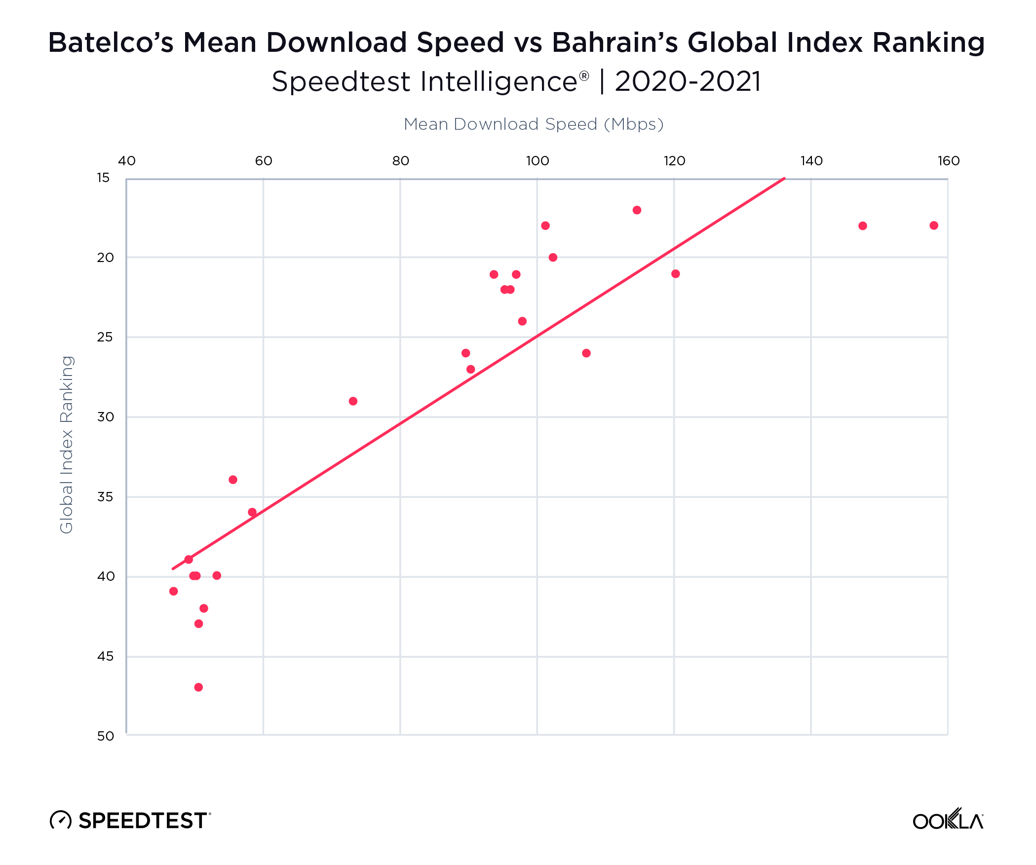 Batelco’s network improvements strongly influenced Bahrain’s overall national ranking on the Speedtest Global IndexTM, which improved by 30 places in the list of fastest countries on mobile in 2020. The improvements continued throughout 2021 as well. As Batelco’s mean download speed increased, Bahrain’s Global Index Ranking also increased.