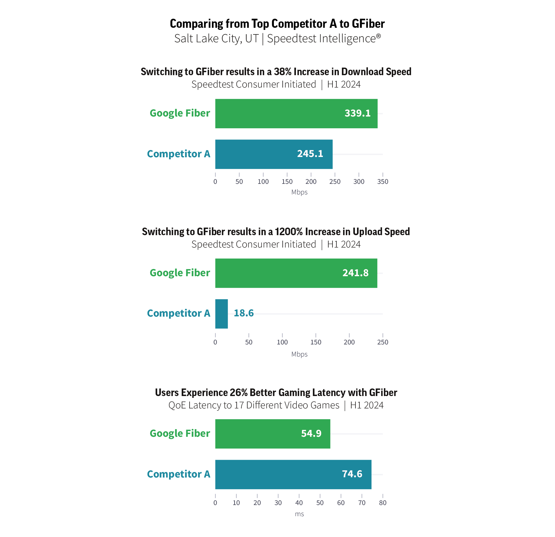 In 2024, users in Salt Lake City typically experience much faster speeds on GFiber compared to those from their previous ISP. This demonstrates GFiber’s ability to not only introduce competitive speeds in new markets but also maintain and enhance service quality in markets they have been serving for years. Speedtest data allows GFiber to consistently track and optimize its network performance, ensuring that all customers, whether in new or long-established markets, receive the best possible internet experience.