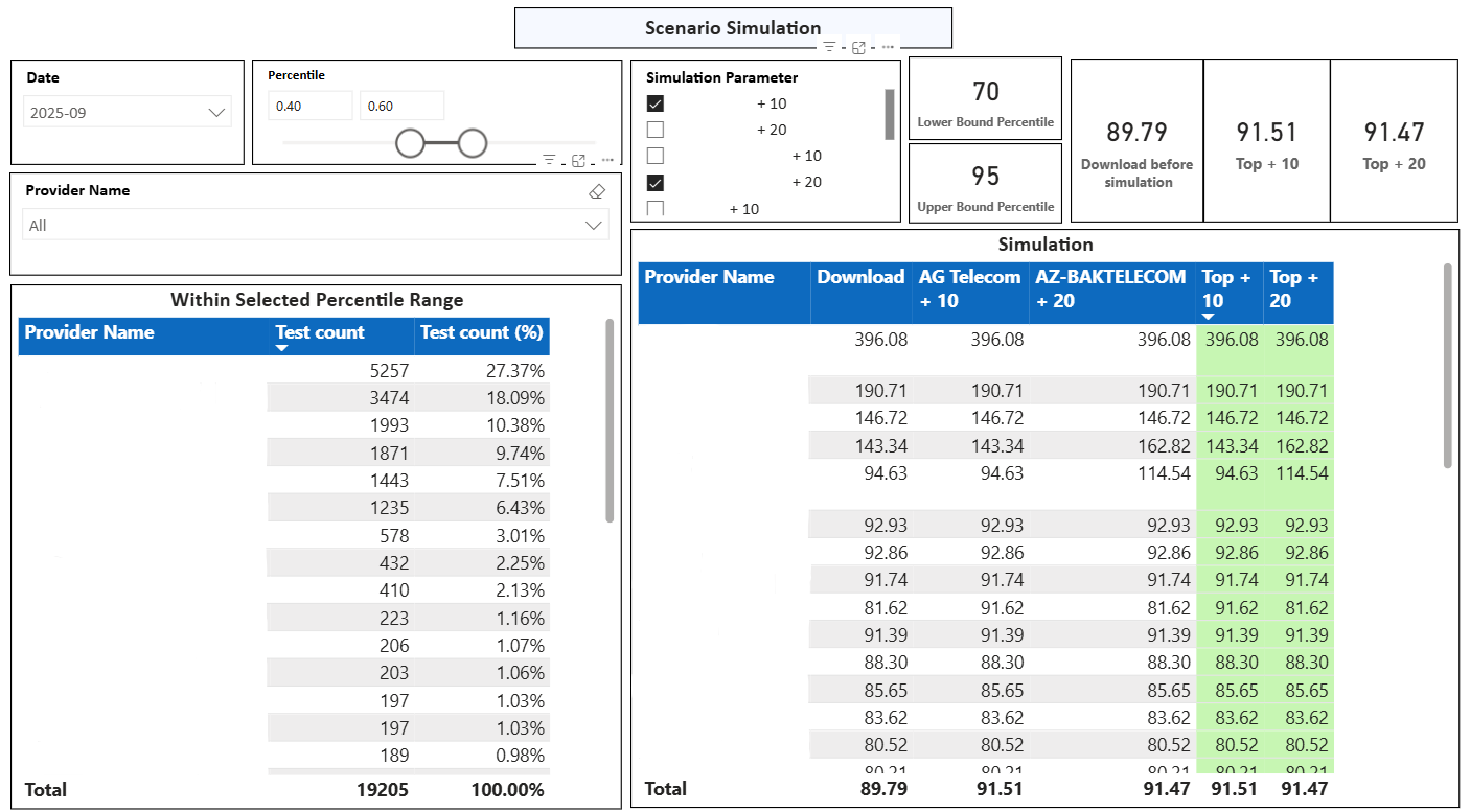 To address the core challenges of performance tracking, declaration validation, and strategic targeting, ICTA developed a unified approach using Ookla Speedtest data and internally built Power BI dashboards. Rather than relying on off-the-shelf solutions, the agency designed custom tools tailored to Azerbaijan’s regulatory needs.