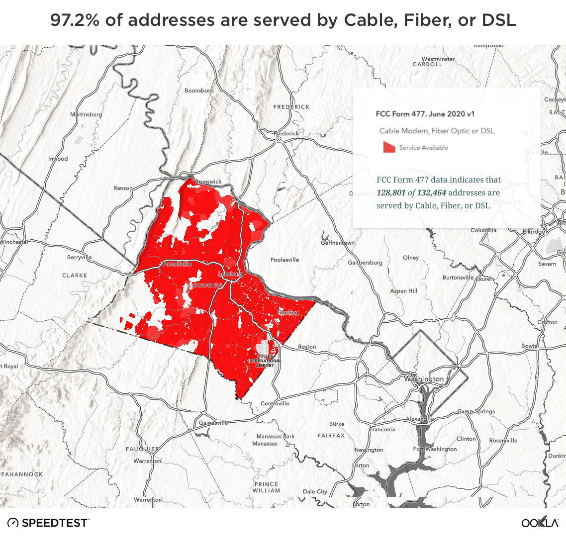 In an effort to close the digital divide in rural and urban communities across the nation, the United States federal government has allocated billions of dollars in broadband funding with the American Rescue Plan (ARP) Act. Funding allocation is based on current federal broadband mapping through FCC Form 477 data. For Loudoun County, FCC data reports: