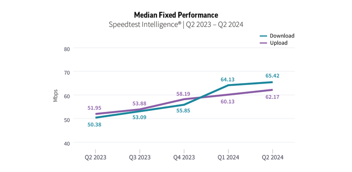 Fixed broadband speeds have improved, with Speedtest Intelligence showing that all fixed broadband providers combined in Uzbekistan showed an increase in median download speed, jumping from 50.38 Mbps in Q2 2023 to 65.42 Mbps in Q2 2024