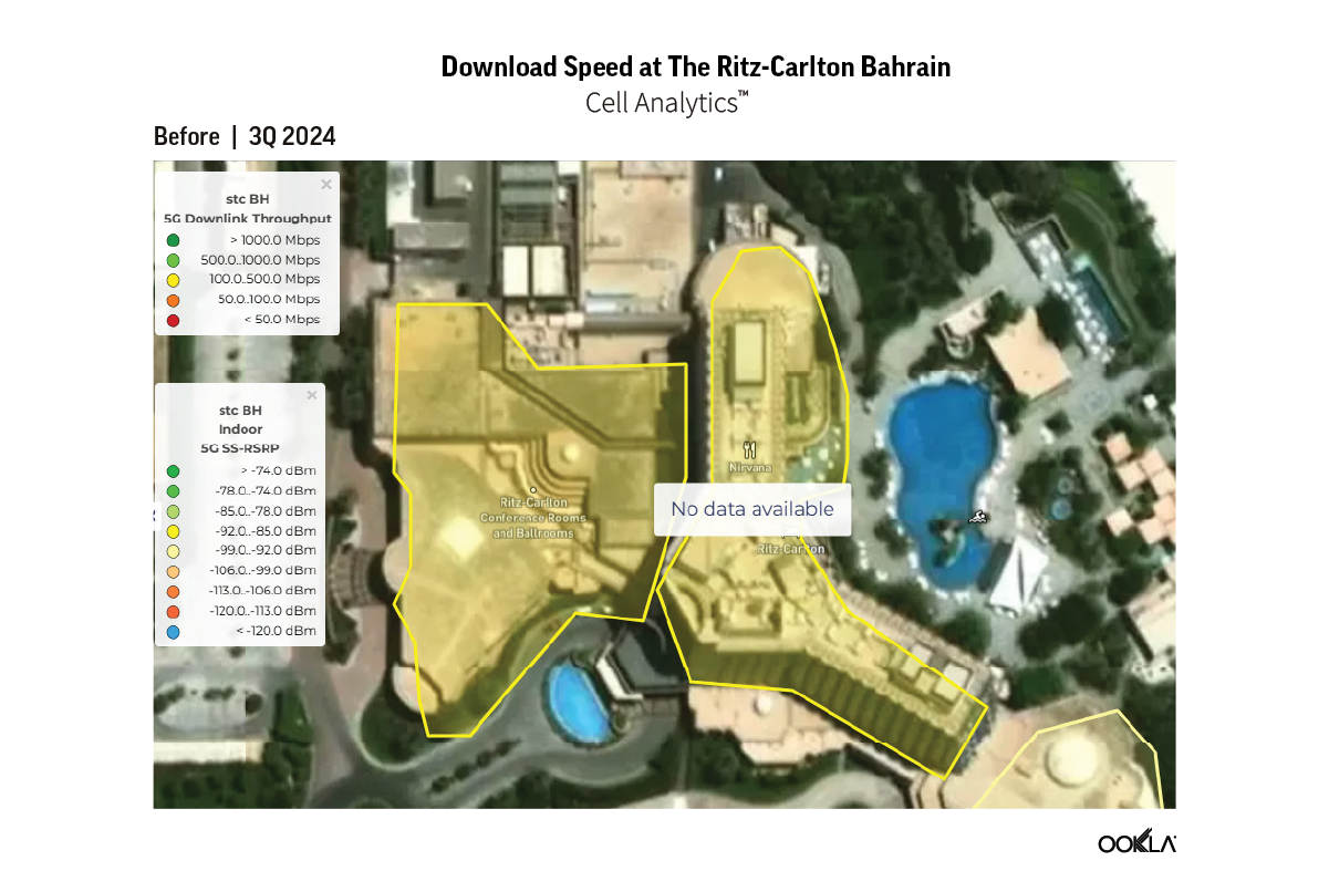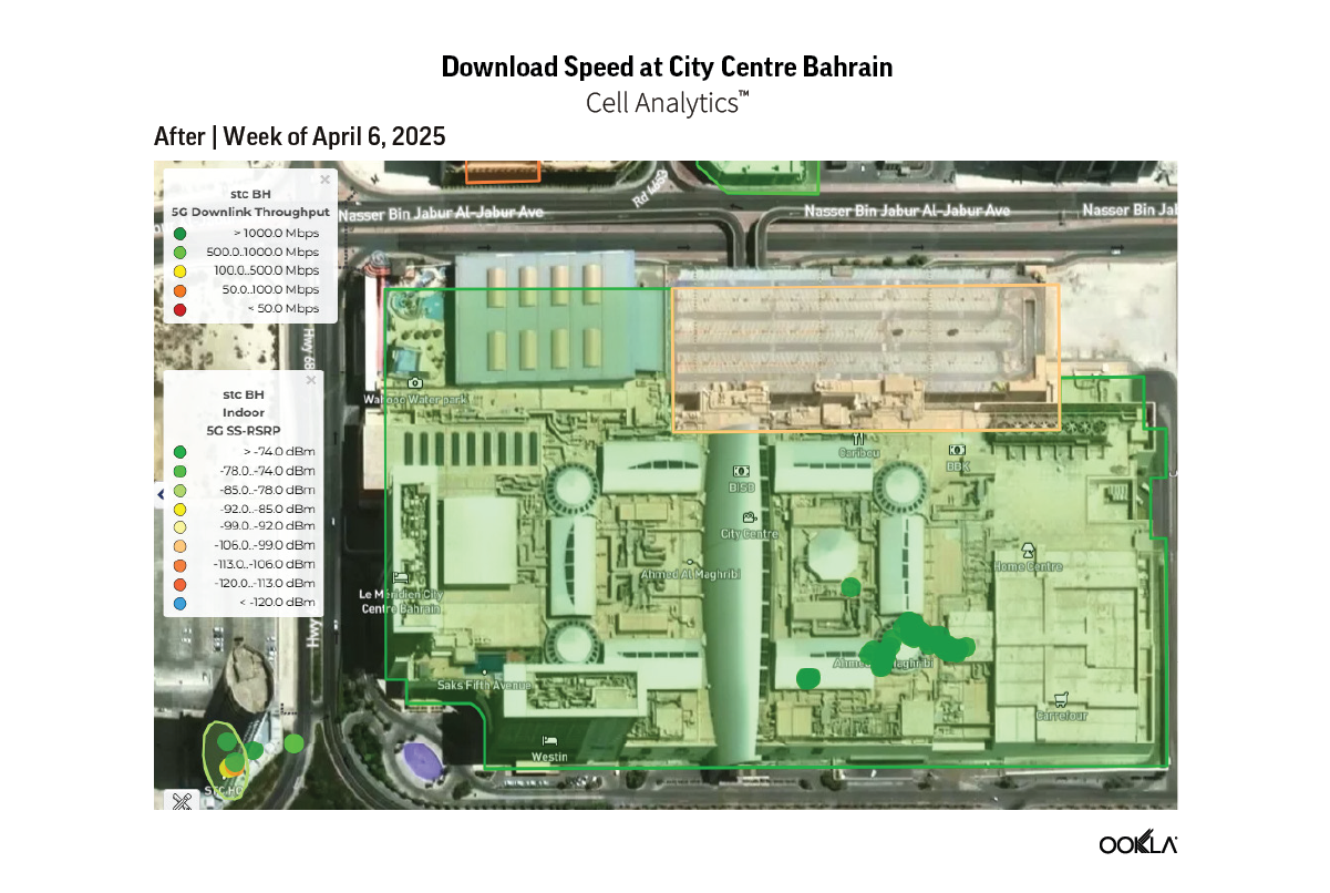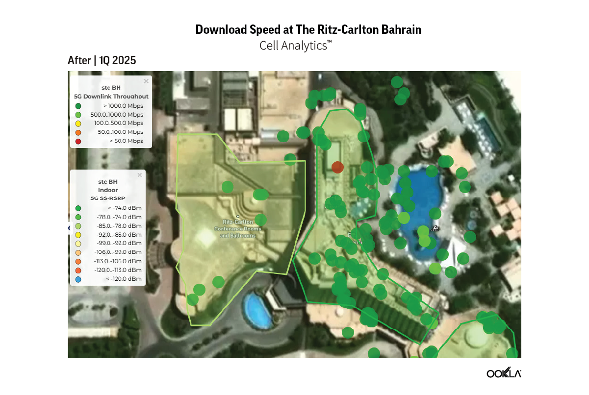 After deployment, stc Bahrain validated the improved speeds and coverage at both The Ritz-Carlton Bahrain and City Centre Bahrain using the same Ookla tools, confirming significant performance gains, including achieving gigabit-level 5G download speeds.