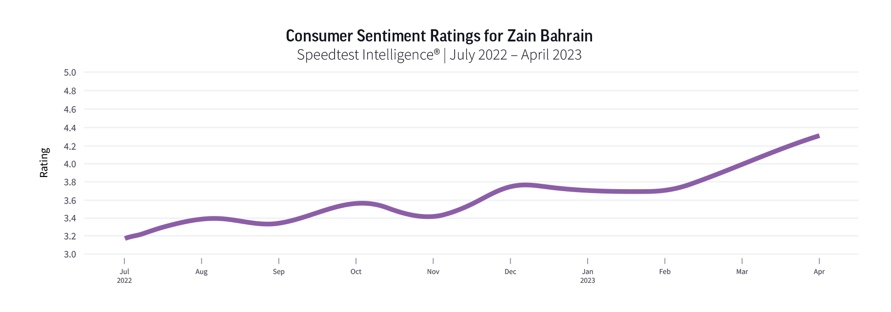 Zain’s improved performance and coverage led to a higher Ookla Consumer Sentiment Rating which is based on five-star ratings provided by customers at the end-of-test survey in Speedtest®. As you can see below, Zain’s overall customer satisfaction rating improved steadily over 2023.