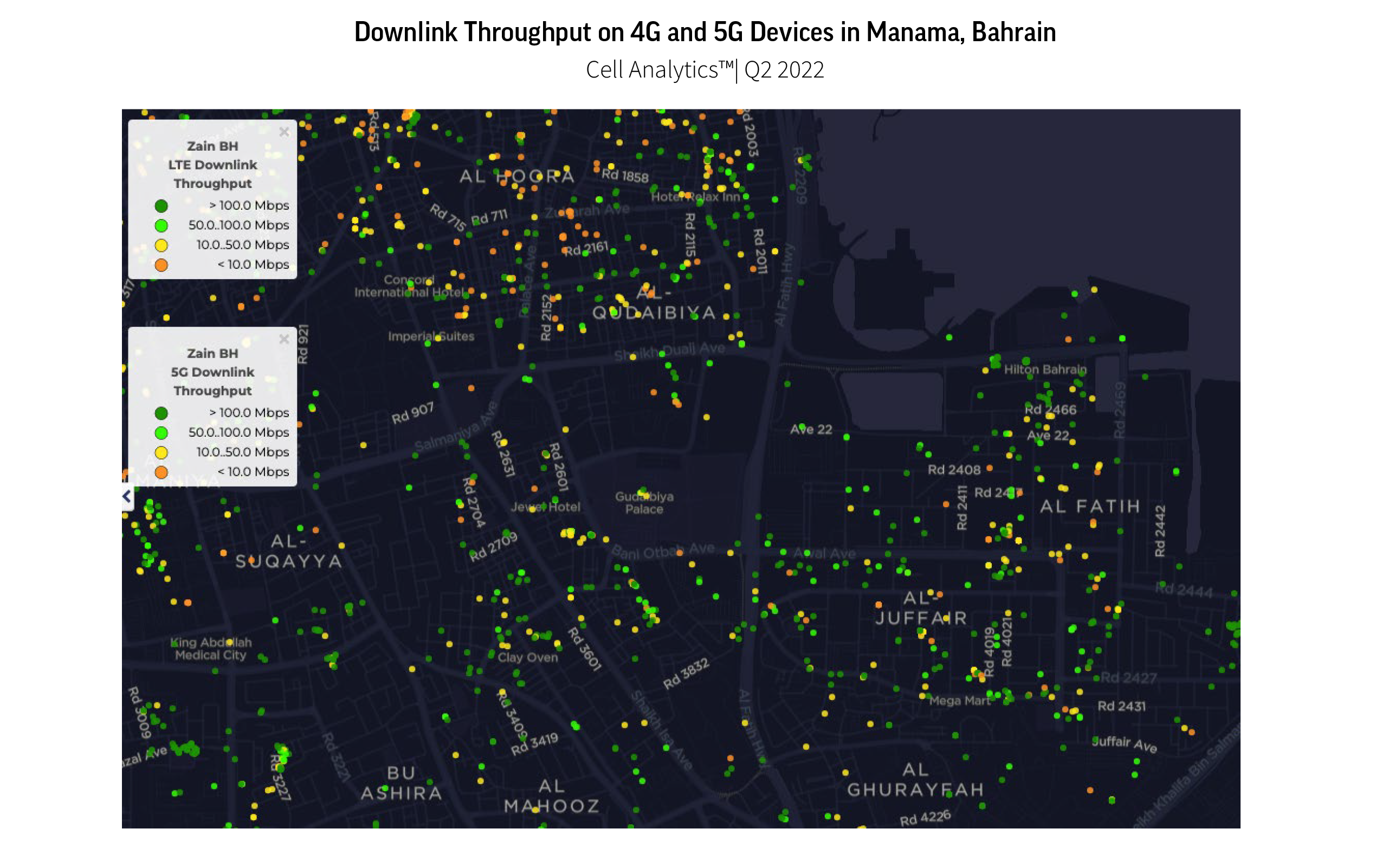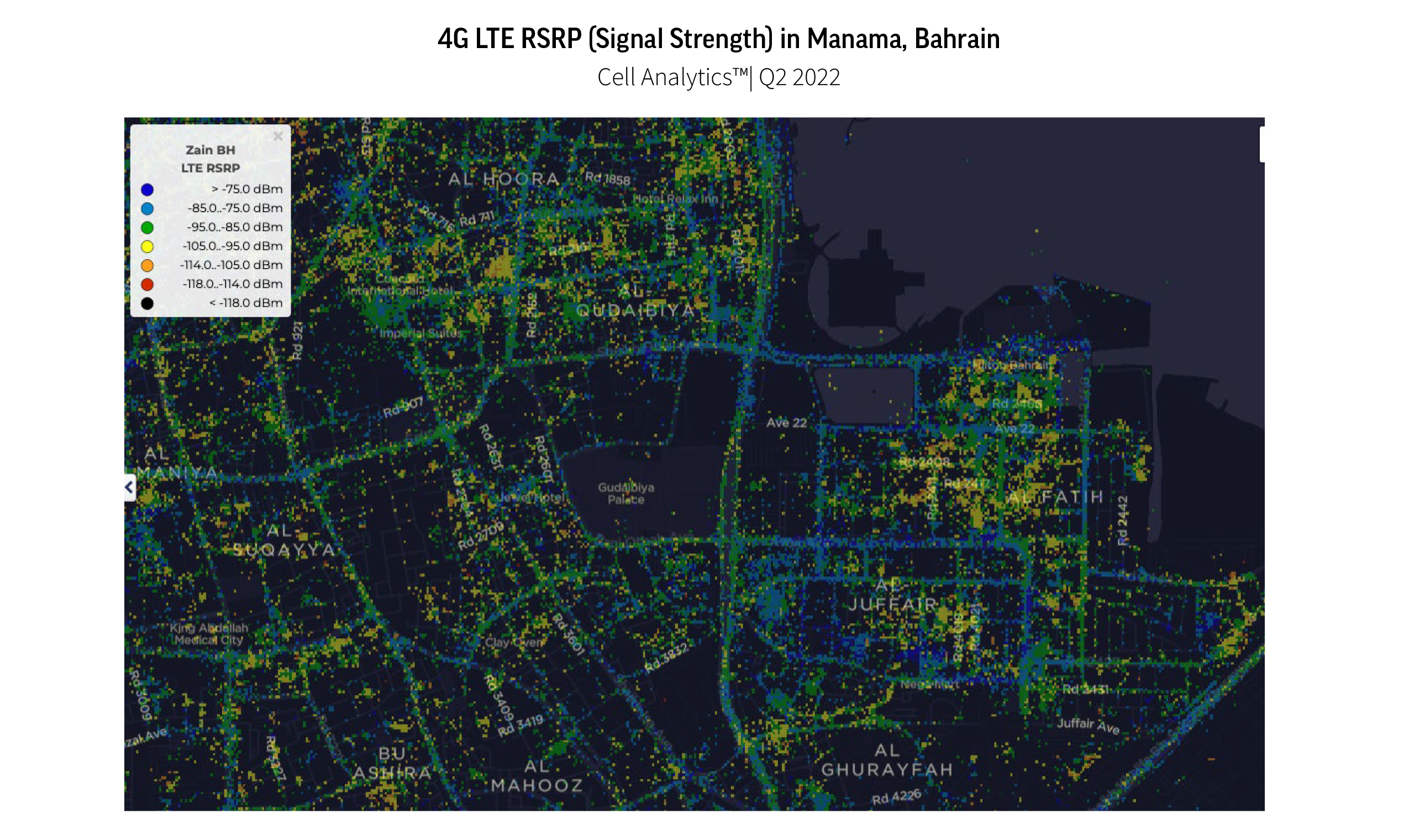 Using crowdsourced network intelligence in Cell Analytics, Zain Bahrain was able to find out where customers were still relying on 3G — down to where subscribers have user equipment that can’t connect to modern network technology. Looking at downlink throughput on 3G Devices in Bahrain during Q2 2022, we can see that there was a concentration of 3G users in the capital city of Manama.