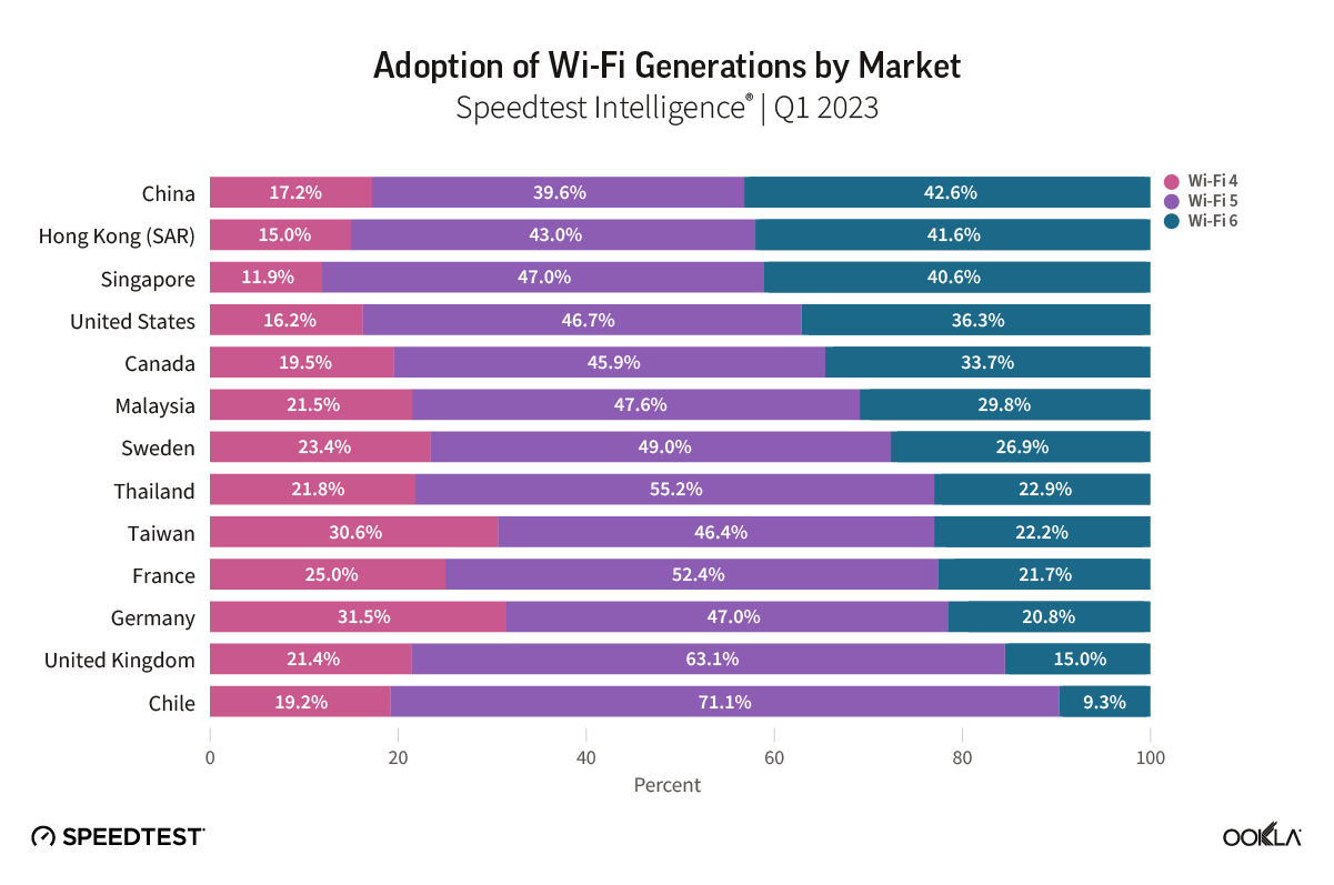 - Developed Asian and North American markets lead the charge to Wi-Fi 6/6E. Wi-Fi 4 and 5 remain the dominant Wi-Fi access technologies globally, accounting for a combined 89% of Speedtest® samples during Q1 2023. However, a number of advanced fixed broadband markets are rapidly migrating to Wi-Fi 6 and 6E, with China, Hong Kong (SAR), Singapore, Canada, and the U.S. leading the charge.