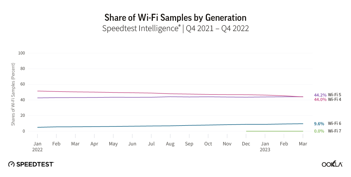 - Wi-Fi woes continue. Ookla® Speedtest Intelligence® data shows Wi-Fi performance continues to lag behind ethernet performance within home networks in many advanced fixed broadband markets, with Wi-Fi speeds typically ranging from between 30-40% of ethernet speeds during Q1 2023.
