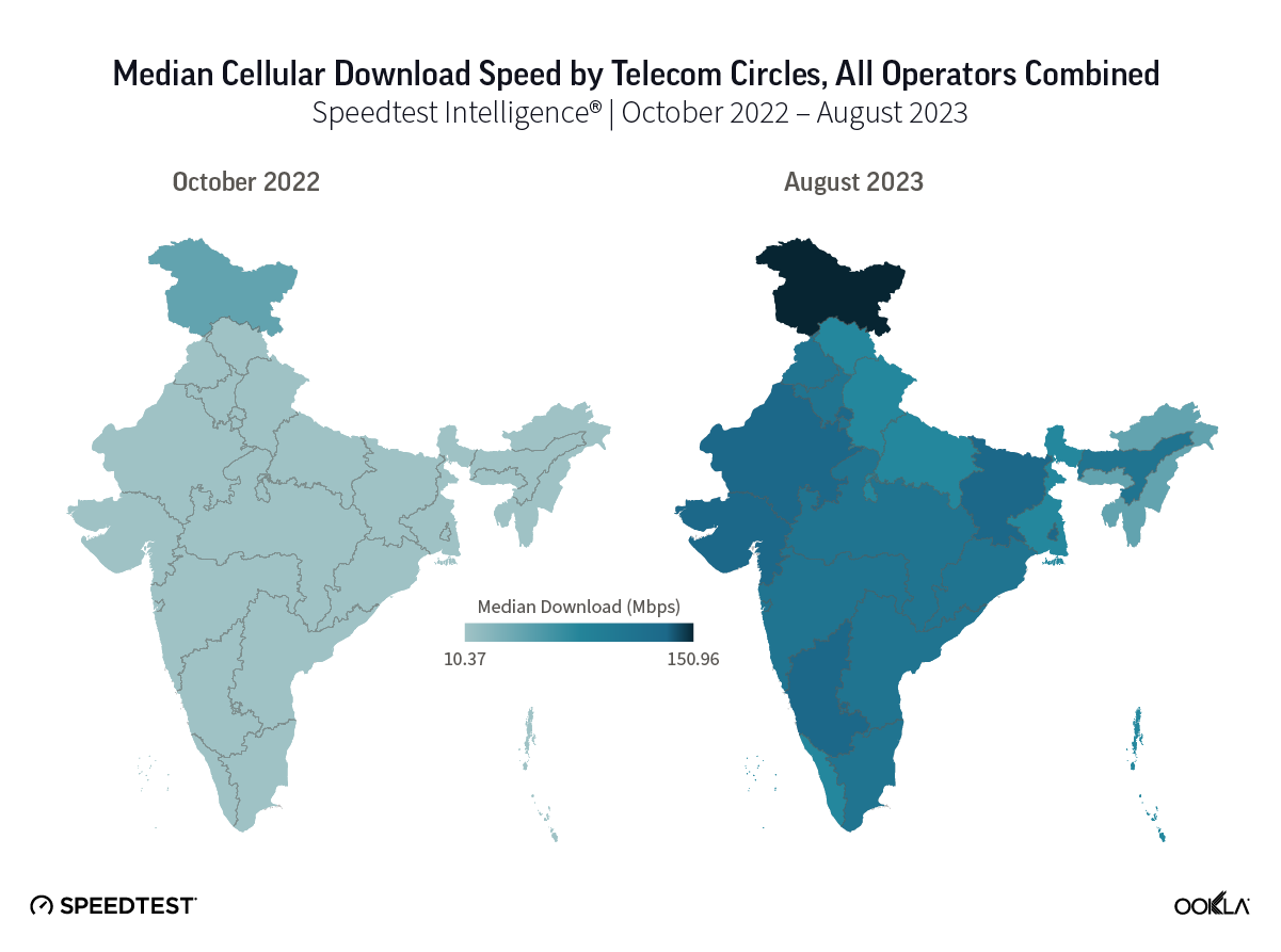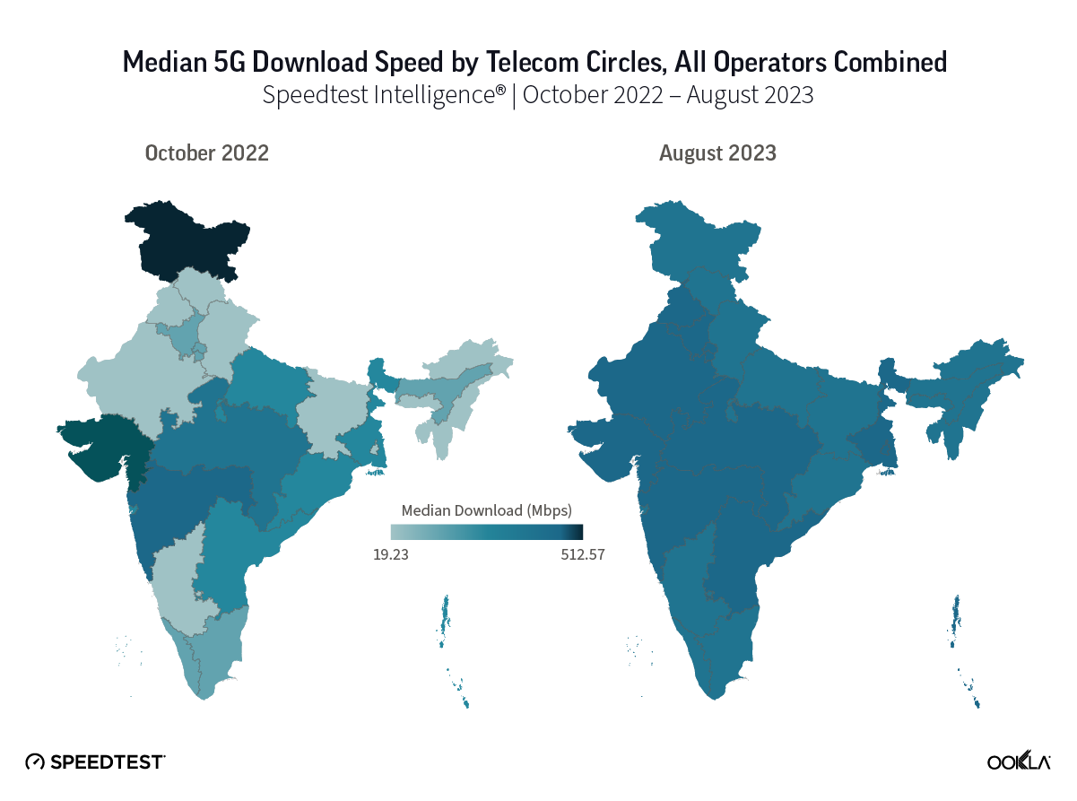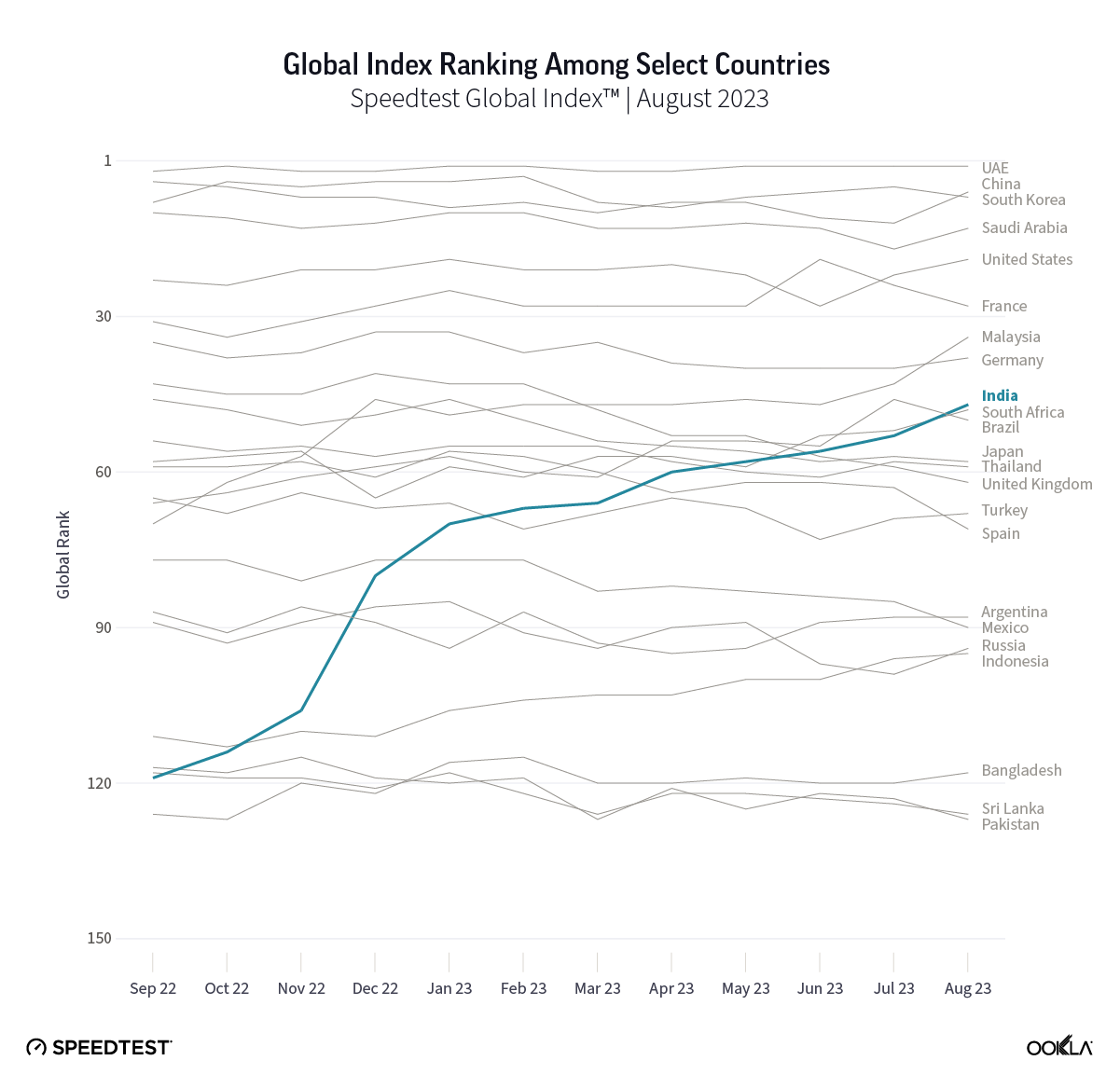 - India ranked 47 in August 2023. The country’s speed performance has seen a 3.59 times increase since the introduction 5G, with median download speeds improving from 13.87 Mbps in September 2022 to 50.21 Mbps in August 2023. This improvement has led to India’s rise in the Speedtest Global Index, moving up 72 places, from 119th place to the 47th position.