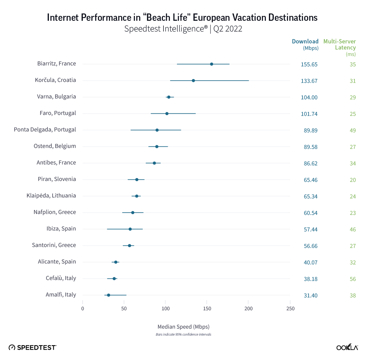 Nothing says summer like relaxing on the beach. If your beach vacation needs fast internet access, surf the web in Biarritz, France and Korčula, Croatia. These two locales had the fastest median download speeds on our beach life list during Q2 2022 at 155.65 Mbps and 133.67 Mbps, respectively, though this is not a statistically significant difference. Varna, Bulgaria and Faro, Portugal rounded out the top four at 104.00 Mbps and 101.74 Mbps, respectively.
