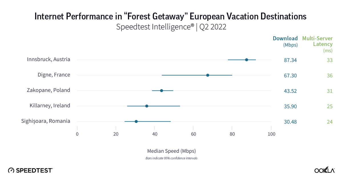 Some people swear by the forest for the best vacations, especially in the heat of summer. The Alpine cities of Innsbruck, Austria and Digne-les-Bains, France had the fastest median download speeds over mobile on our list of forest getaways during Q2 2022 at 87.34 Mbps and 67.30 Mbps, respectively, though there was no statistical winner between the two. There was also no statistically significant difference between the median download speeds in Zakopane, Poland (43.52 Mbps); Killarney, Ireland (35.90 Mbps); and Sighișoara, Romania (30.48 Mbps). While you may prefer to be offline in the woods, having a strong and fast internet connection available can help you navigate with GPS, check out the names of all the flora you’re encountering, or reach help in case of emergency.