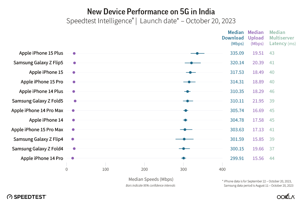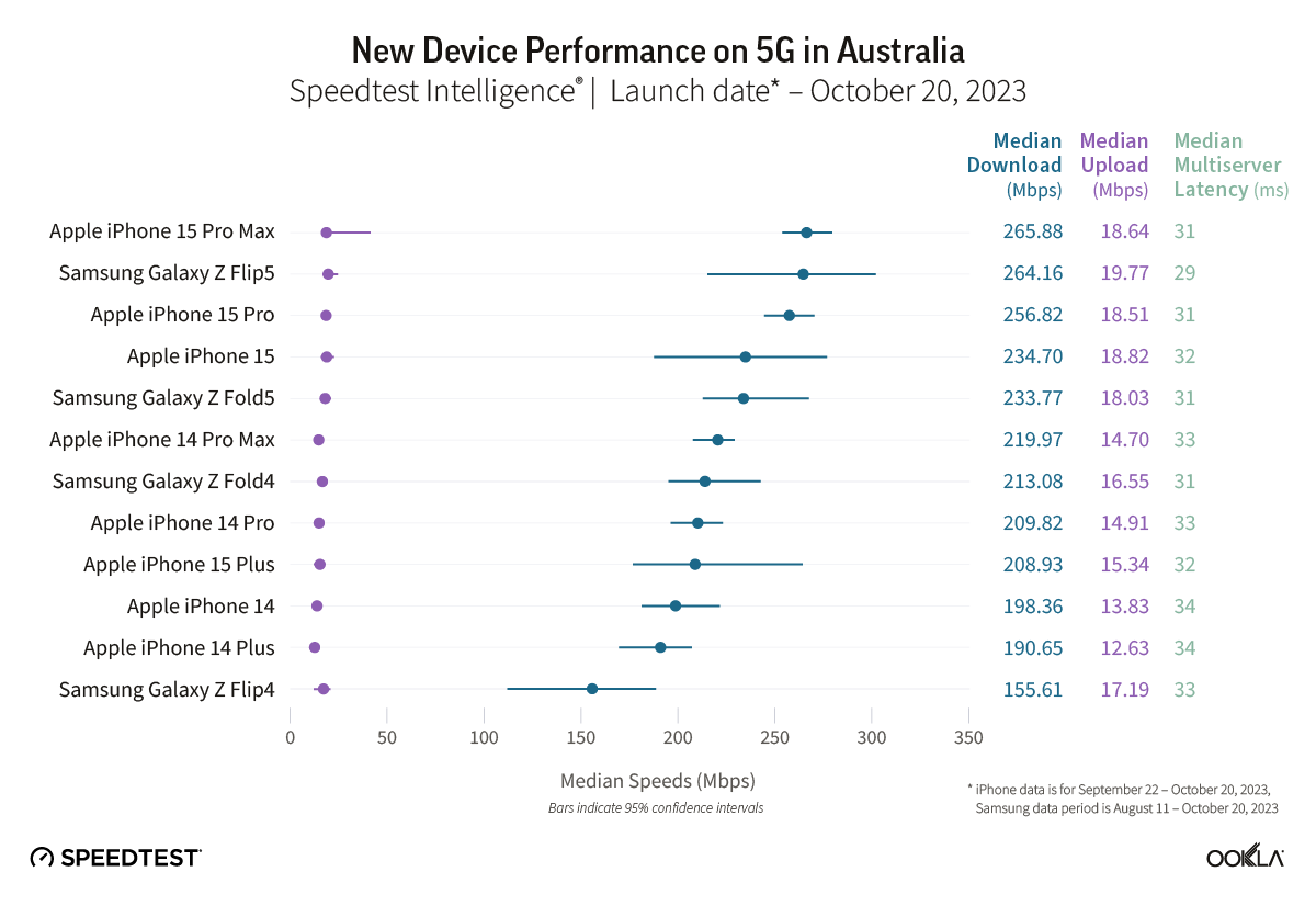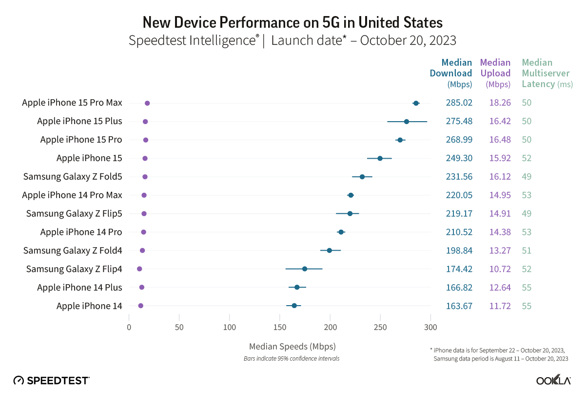 To upgrade or not to upgrade, with Black Friday and Cyber Monday deals on the latest iPhone and Samsung devices on the horizon you may be asking yourself just that question. We analyzed data from Speedtest Intelligence® in 13 major markets to see how well the Apple iPhone 15 devices and the Samsung Galaxy Z Fold5 and Flip5 models are performing in comparison to last year’s models over 5G to help you make an informed decision. For details on performance by Samsung Galaxy S23 models, read our analysis from earlier this year. We’re especially interested in seeing if technical improvements on iPhone 15 models including support for WiFi 6E drive better performance.