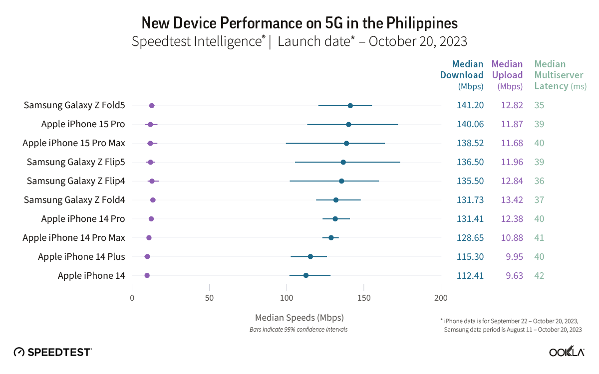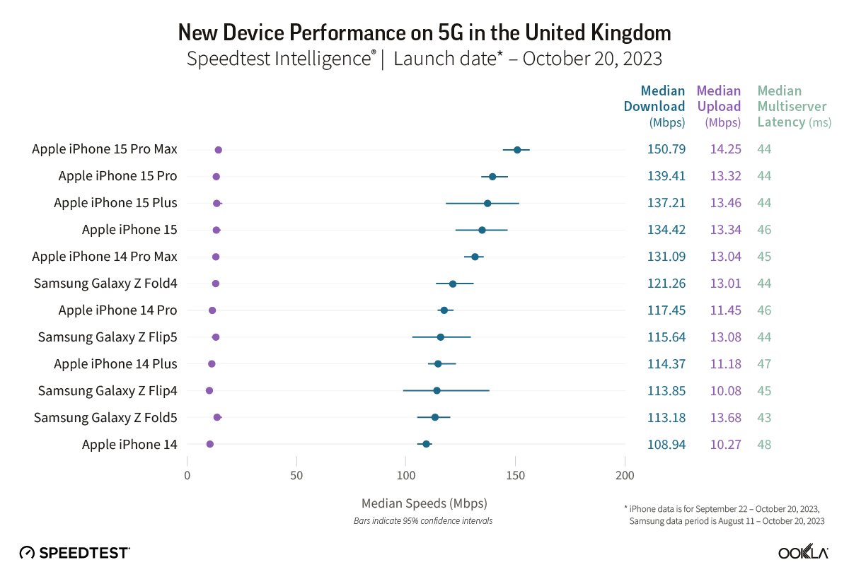 Data for iPhone models is provided for the period from September 22-October 20, 2023, while data for the Samsung models is for the period from August 11-October 20, 2023. Keep in mind that device data differs across markets due to a variety of factors, including: 5G investments by governments and mobile operators, different 5G spectrum allocations, and mobile 5G plans. As many of these devices are very new, the sample counts in some countries are still low so the statistical ranges of expected performance are wider for the newer devices than the older models.