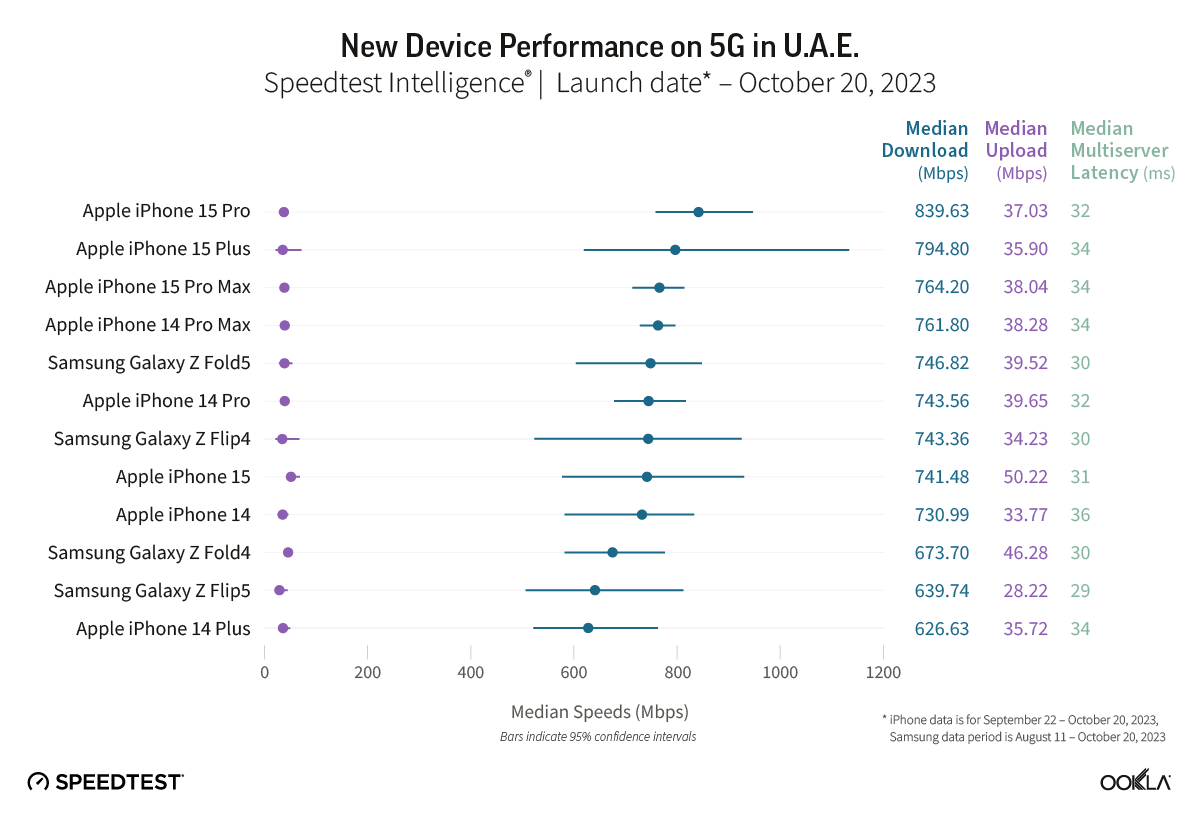 While Speedtest Intelligence data did not show significant increases in median download speed over 5G for the iPhone 15 Pro or the iPhone 15 Pro Max during the September 22-October 20, 2023 period, performance likely isn’t a concern in the United Arab Emirates, whose blisteringly fast download speeds topped the Speedtest Global Index™ in September 2023. There were not enough samples to properly assess the performance of the other two iPhone models.