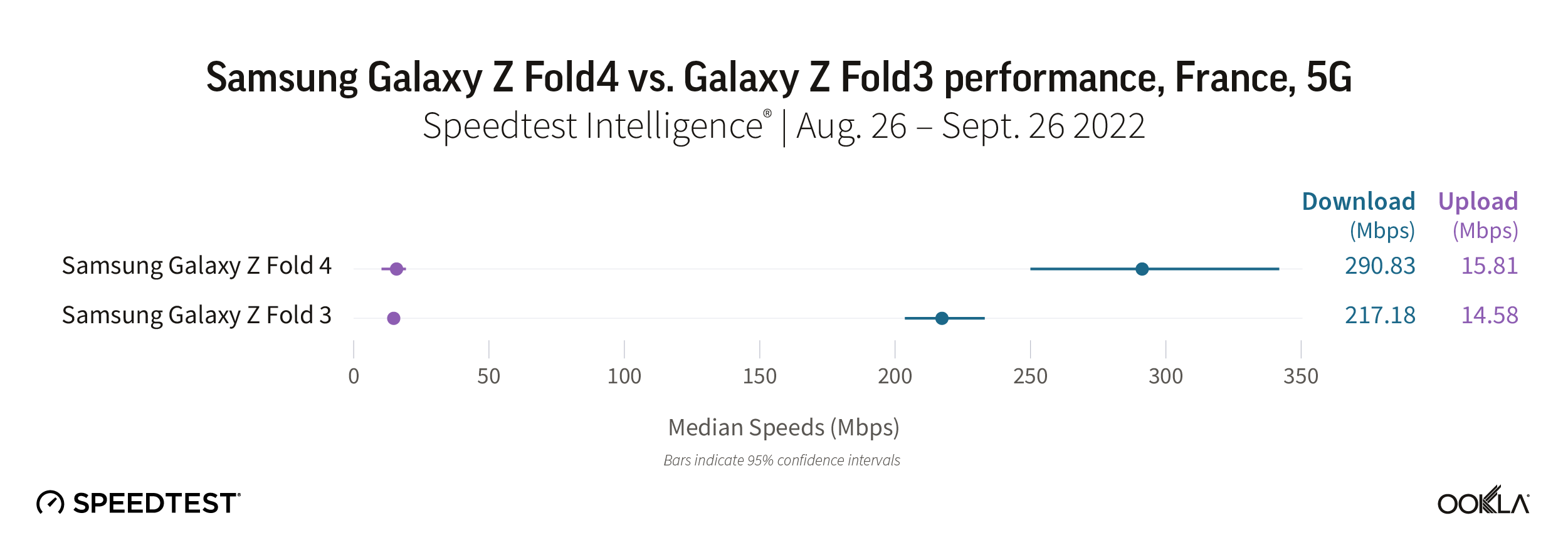 Consumers across the world have been waiting for the recent launches of new Apple iPhone 14 devices and the Samsung Galaxy Z Fold4. With new chipsets and technologies, Ookla® was curious to see how much faster these devices were performing against previous models, so we used Speedtest Intelligence® to look at data from select countries during the first few weeks after launch. We compared how the iPhone 14 devices are performing against their iPhone 13 counterparts over 5G and how the Samsung Galaxy Z Fold4 is performing against the Galaxy Z Fold3 over 5G.