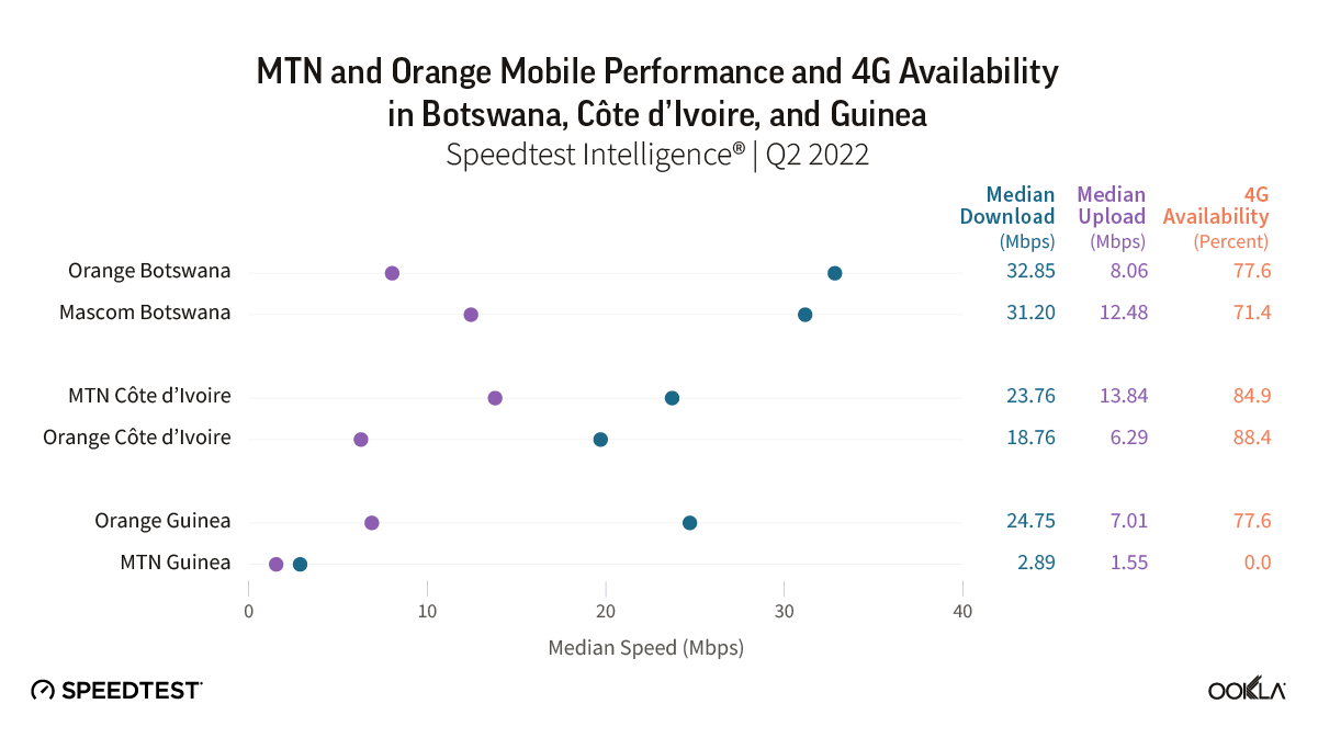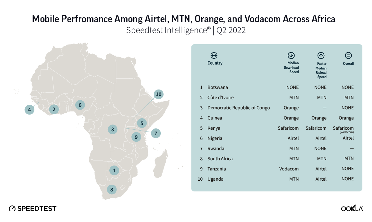 - Comparing Airtel and MTN performance across the three countries they operate in, Airtel took the top spot in Nigeria, both in terms of median download and upload speed in Q2 2022, while in Uganda and Rwanda there were no winners. Such was the case in Botswana too, where there was no winner between Mascom and Orange.
