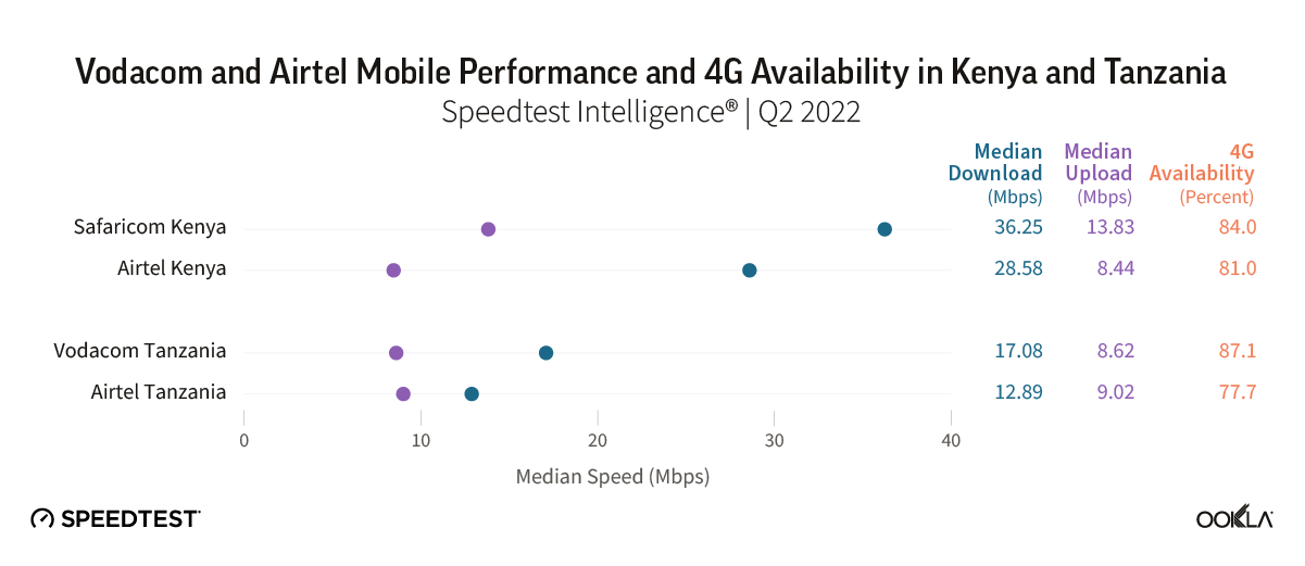 - Safaricom also exhibited better network performance during Q2 2022, with a median download speed of 36.25 Mbps and upload of 13.83 Mbps, compared to Airtel (28.58 Mbps download speed and 8.44 Mbps upload).