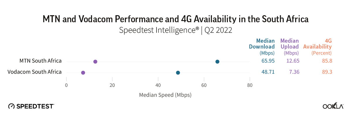 - Speedtest Intelligence® data shows that MTN South Africa delivered the fastest median download speeds across analyzed operators, at 65.95 Mbps in Q2 2022. However, Vodacom in Johannesburg was the fastest operator considering speeds across top cities, reaching 81.36 Mbps median download speed in Q2 2022. In South Africa, MTN outperformed Vodacom in terms of median mobile speeds during Q2 2022.