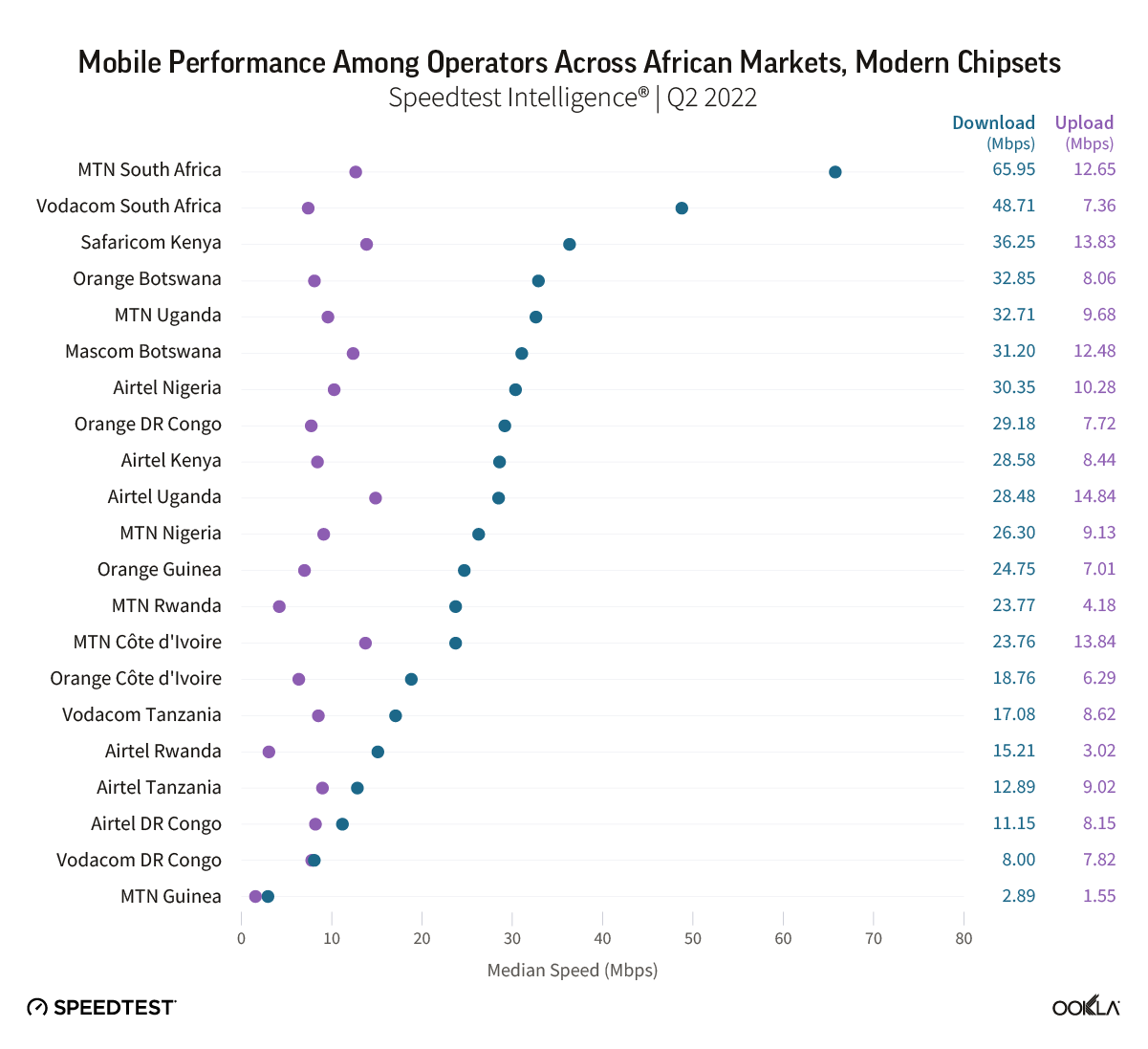Using Speedtest Intelligence® data we compared mobile performance in Q2 2022 on modern chipsets across 21 operators. Our results show that median download speeds ranged between 2.89 Mbps (MTN Guinea) and 65.95 Mbps (MTN South Africa). Median upload speeds varied between 1.55 Mbps (MTN Guinea) and 14.84 Mbps (Airtel Uganda).