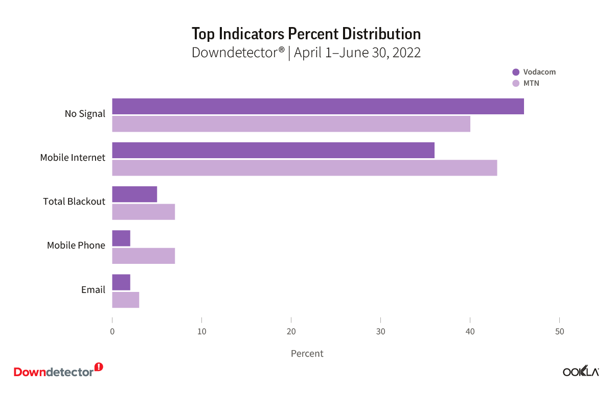 We have seen these outages reflected in Downdetector® data, which is the world’s most popular platform for user-reported service status information. During Q2 2022 users reported 46,810 incidents for Vodacom and 34,882 problems for MTN. There were two top issues reported: no signal and no mobile internet: lack of signal accounted for the majority (46%) of Vodacom’s reported outages, followed by inability to access mobile internet (36%). This has been reversed for MTN — majority of issues were related to mobile internet (43%), followed by no signal (40%). Noteworthy is the fact that there were reports of total blackouts: 7% for Vodacom and 5% for MTN.
