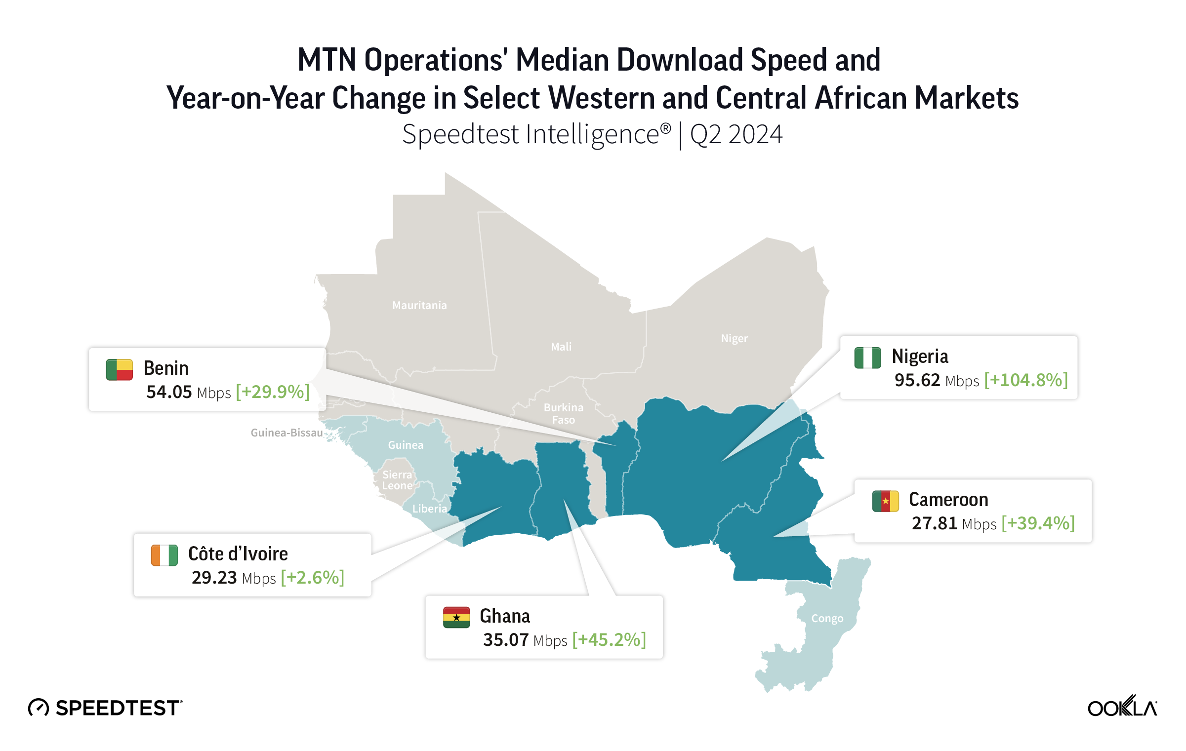 - Nigeria leads MTN opcos in West and Central Africa (WCA) in mobile download speed for handsets with modern chipsets, according to Speedtest Intelligence®. In Q2 2024, MTN Nigeria significantly widened its lead over the other opcos in WCA in terms of download speeds, reaching 95.62 Mbps. MTN Nigeria also excelled in median upload speed at 17.01 Mbps, closely followed by MTN Ghana at 16.74 Mbps.