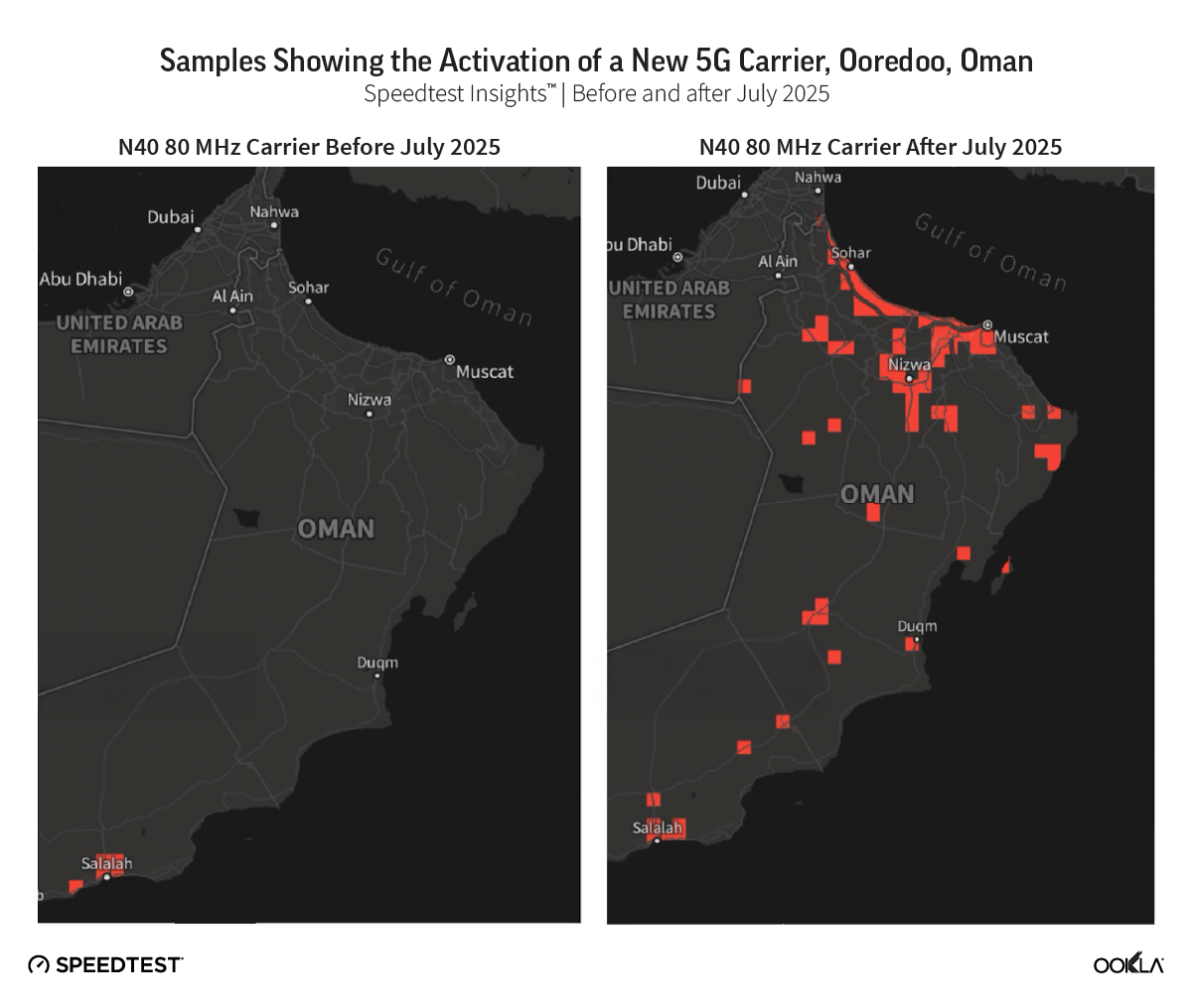 Ookla data also reveals operators are exploring the use of new spectrum bands for 5G. For example, Omantel is considering 900 MHz and 2100 MHz bands, while Ooredoo is testing 1800 MHz and 800 MHz bands. It has also activated 80 MHz in the 2300 MHz band in the summer of 2025 (see image below). Access to additional spectrum bands provides the operators with faster speeds, increased capacity, wider coverage, and lower latency. Specifically, access to low-band, sub-GHz spectrum improves session continuity and provides wider coverage, and when aggregated with mid-band spectrum, allows increased download capacity.