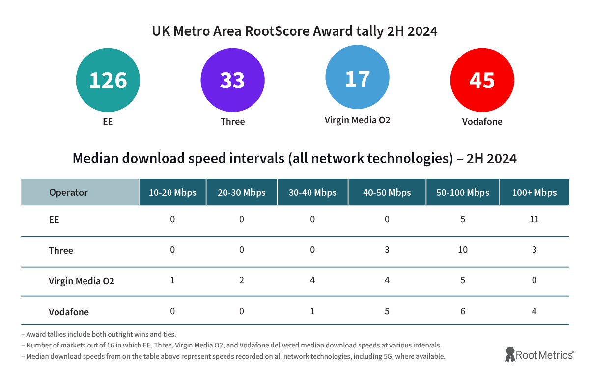 EE won or shared every UK-wide RootScore Award in 2H 2024, including its twenty-third consecutive UK Overall RootScore Award, a period spanning 11.5 years and counting. The operator also earned 31 out of 32 possible Nation RootScore Awards (including ties) across England, Northern Ireland, Scotland, and Wales. Similarly, EE won by far the most awards in major cities with 126 (Vodafone was second with 45).