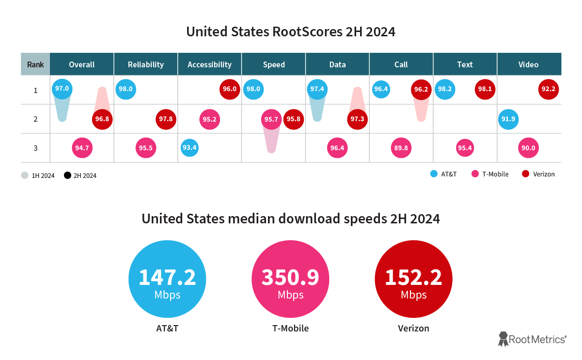 In the second half of 2024, RootMetrics conducted over 3 million tests to measure the real-world mobile performance of the Big 3 mobile carriers in the United States. The following report provides a comprehensive picture of network performance at the U.S. national level, across all 50 states, and 125 of the nation’s largest metropolitan markets.