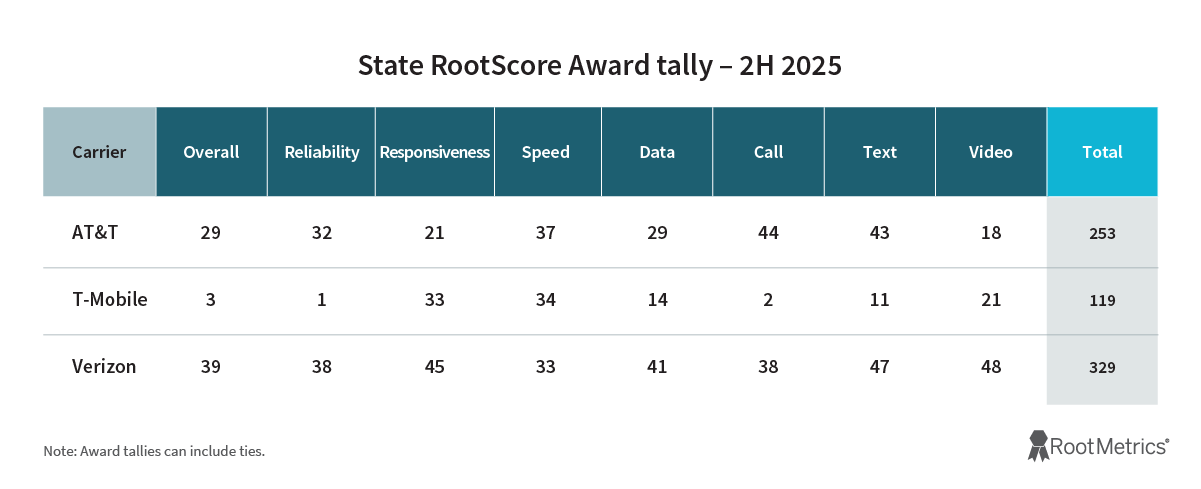 AT&T delivered strong national results in 2H 2025, sharing three U.S. RootScore Awards: Network Speed, Call Performance, and Text Performance. AT&T was a strong number-two performer in state testing, winning or sharing State Overall RootScore Awards in 29 states and earning 253 total state awards. In major cities, AT&T boosted its metro award tally from 592 in 1H 2025 to 648 in 2H 2025 and delivered median download speeds of at least 100 Mbps in 122 of 125 markets, up from 116 in 1H 2025.