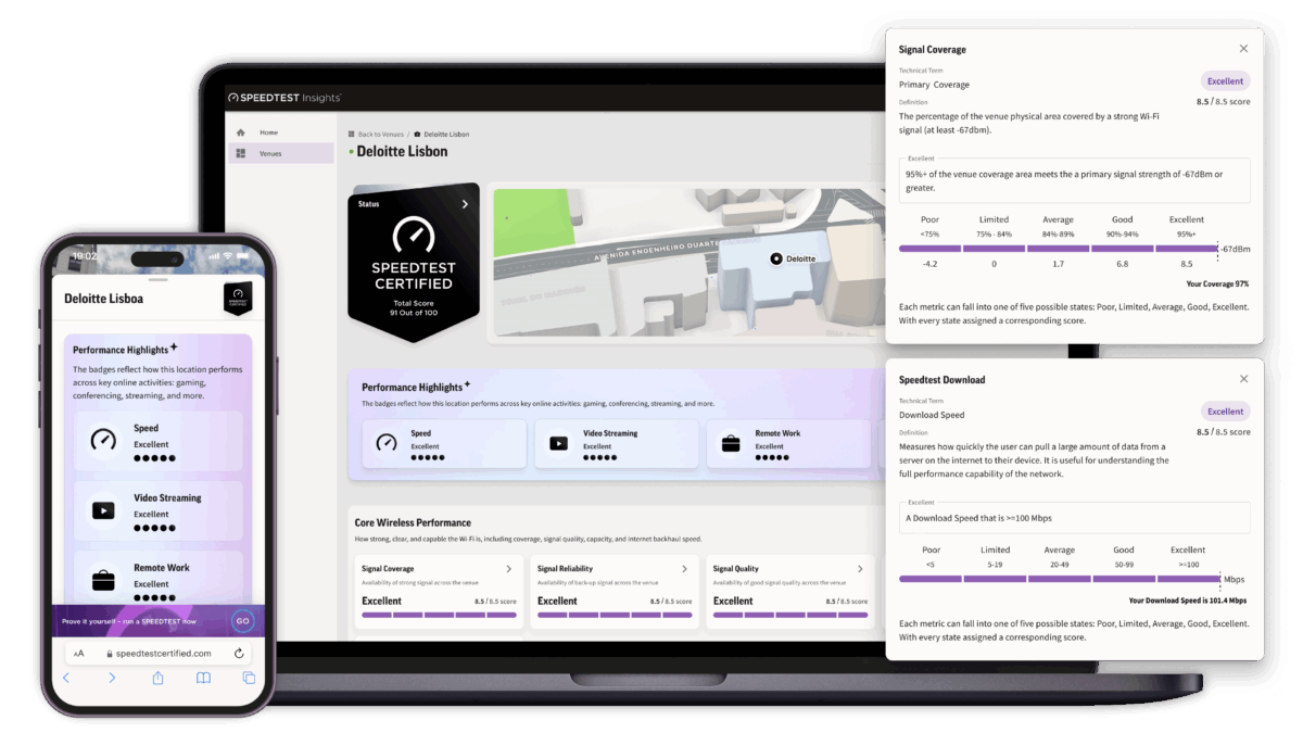 For guests, tenants, and visitors, it offers a simple, trusted way to identify locations with verified connectivity—all backed by the globally recognized Speedtest name.