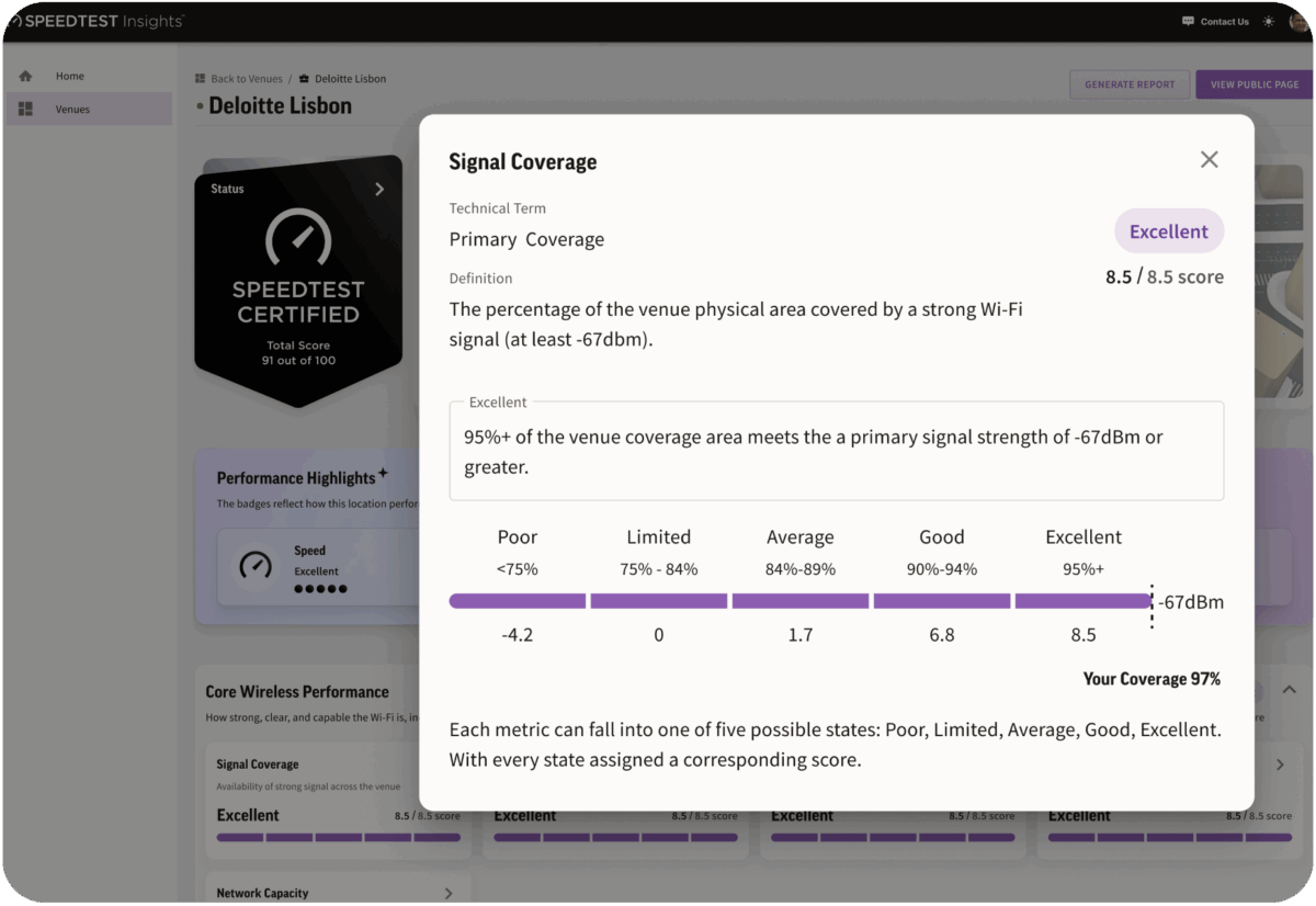 The Speedtest Certified digital portal translates results from your on-site assessment into actionable intelligence. Comprehensive dashboards provide personalized insights and an in-depth analysis of your network performance, configuration, and infrastructure readiness. The platform delivers personalized, actionable recommendations for any areas requiring improvement to meet our standards, while also providing targeted suggestions for network optimizations to further enhance performance.
