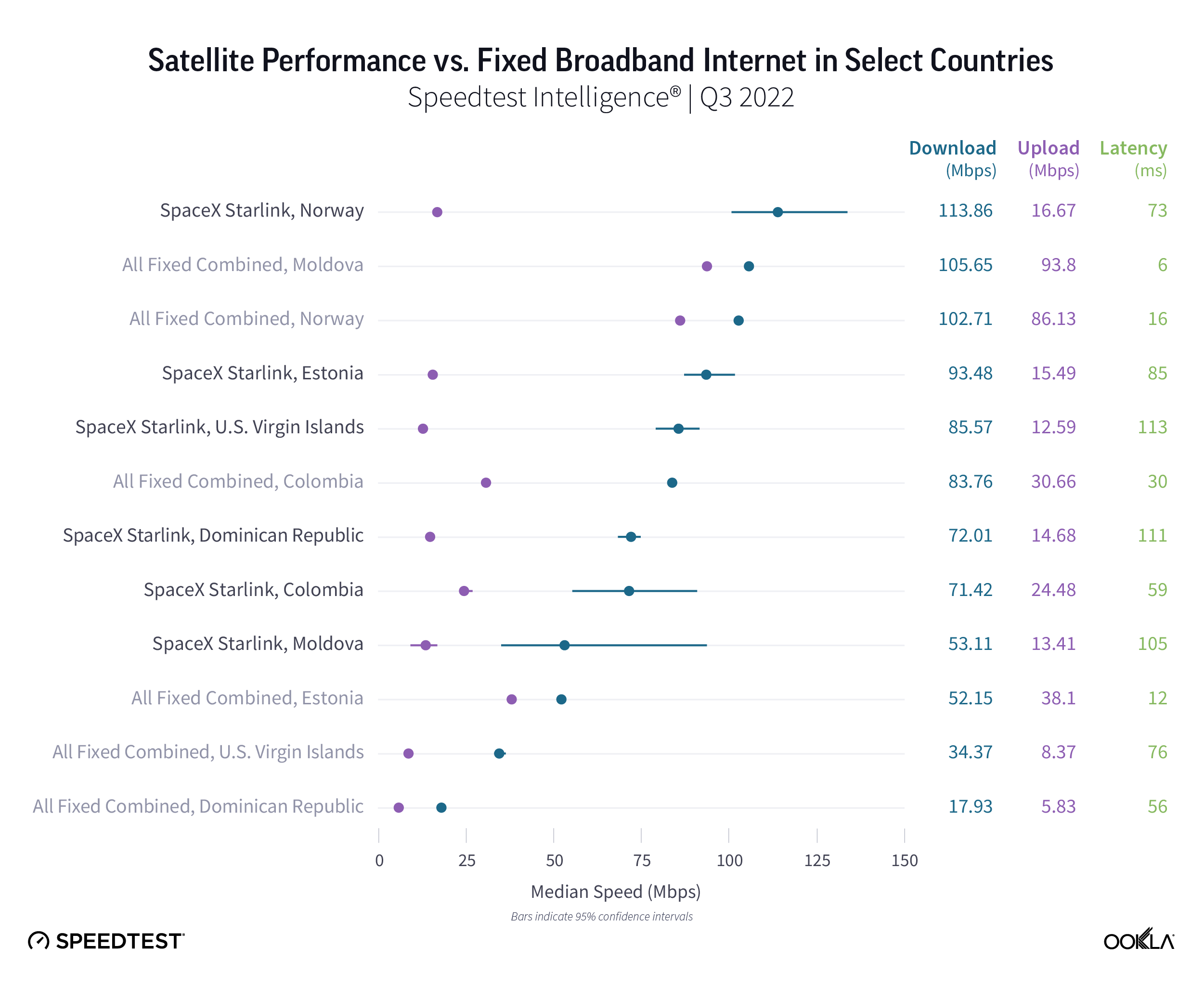 Speedtest Intelligence data shows Starlink data in six new countries during Q3 2022, including Colombia, the Dominican Republic, Estonia, Moldova, Norway, and the U.S. Virgin Islands. Starlink in Estonia (93.48 Mbps), the U.S. Virgin Islands (85.57 Mbps), and the Dominican Republic (72.01 Mbps) were much faster options than fixed broadband providers in their respective countries during Q3 2022. Starlink in Norway (113.86 Mbps) and Colombia (71.42 Mbps) were statistically in the same range as fixed broadband providers in their respective countries during the same time period. Starlink in Moldova (53.11 Mbps) was much slower than all fixed broadband providers combined (105.65 Mbps), though for rural folks with fewer options, still provides a speedy connection.
