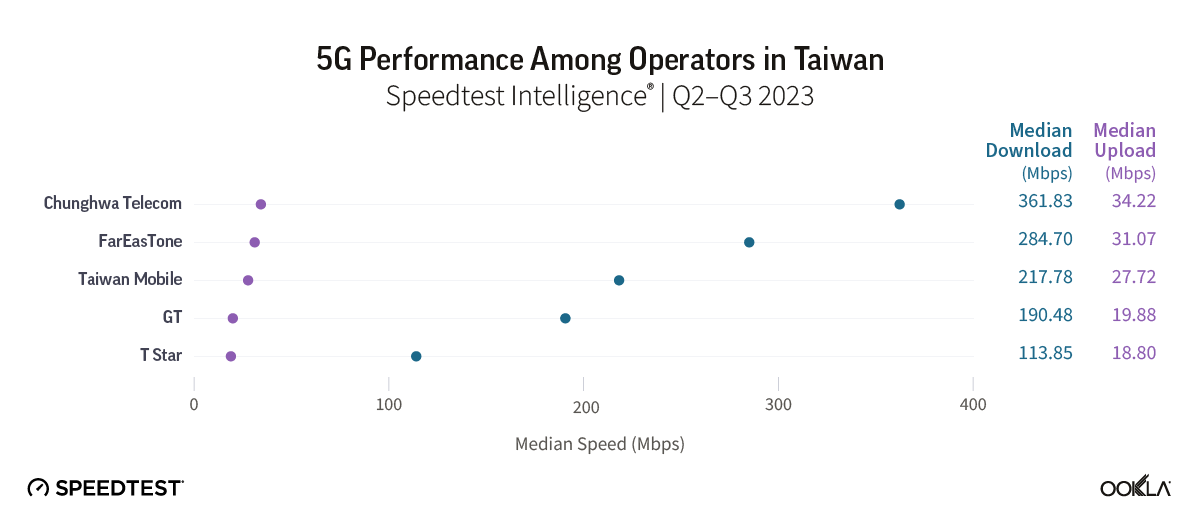 - Chunghwa Telecom leads the way in terms of 5G download speeds. Based on Speedtest Intelligence® data for Q2-Q3 2023, Chunghwa Telecom had the fastest median download speed with a reported speed of 361.83 Mbps. Far EasTone and Taiwan Mobile came in second and third place, respectively. GT and T Star ranked fourth and fifth, with median download speeds of 190.48 Mbps and 113.85 Mbps.