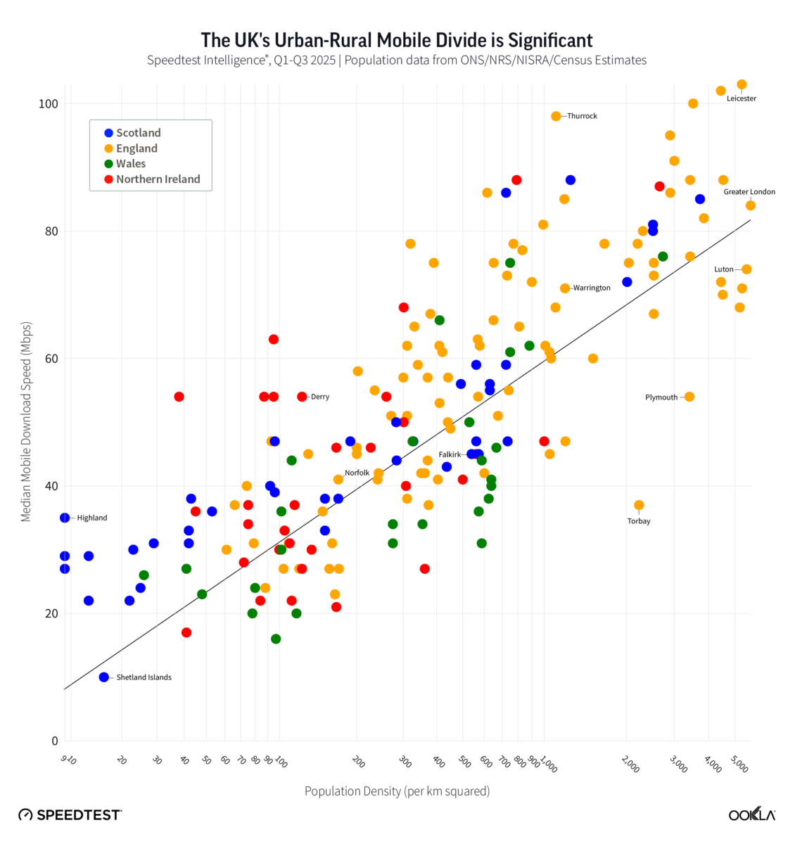 - The gap between local authorities remains stark. In Q1–Q3 2025, median speeds ranged from just over 10 Mbps (Shetland Islands) to just over 100 Mbps (Leicester). Around 28% of local authorities had fewer than 60% of Speedtest samples meeting the 25 Mbps download threshold, indicating persistently poor connectivity for many in the UK.