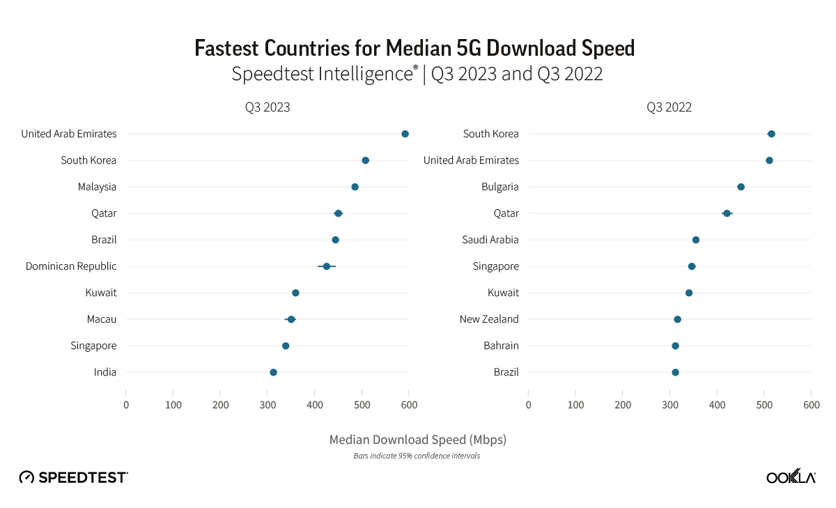 During Q3 2023, the United Arab Emirates and South Korea stood out as leaders in 5G performance, boasting the fastest median 5G download speeds globally at 592.01 Mbps and 507.59 Mbps, respectively. Our top 10 list also includes Malaysia, Qatar, Brazil, the Dominican Republic, Kuwait, Macau, Singapore, and India. The shift in the top 10 rankings reveals dynamic changes, with Malaysia, the Dominican Republic, and India making significant strides, while Bulgaria, Saudi Arabia, New Zealand, and Bahrain dropped out of the rankings.