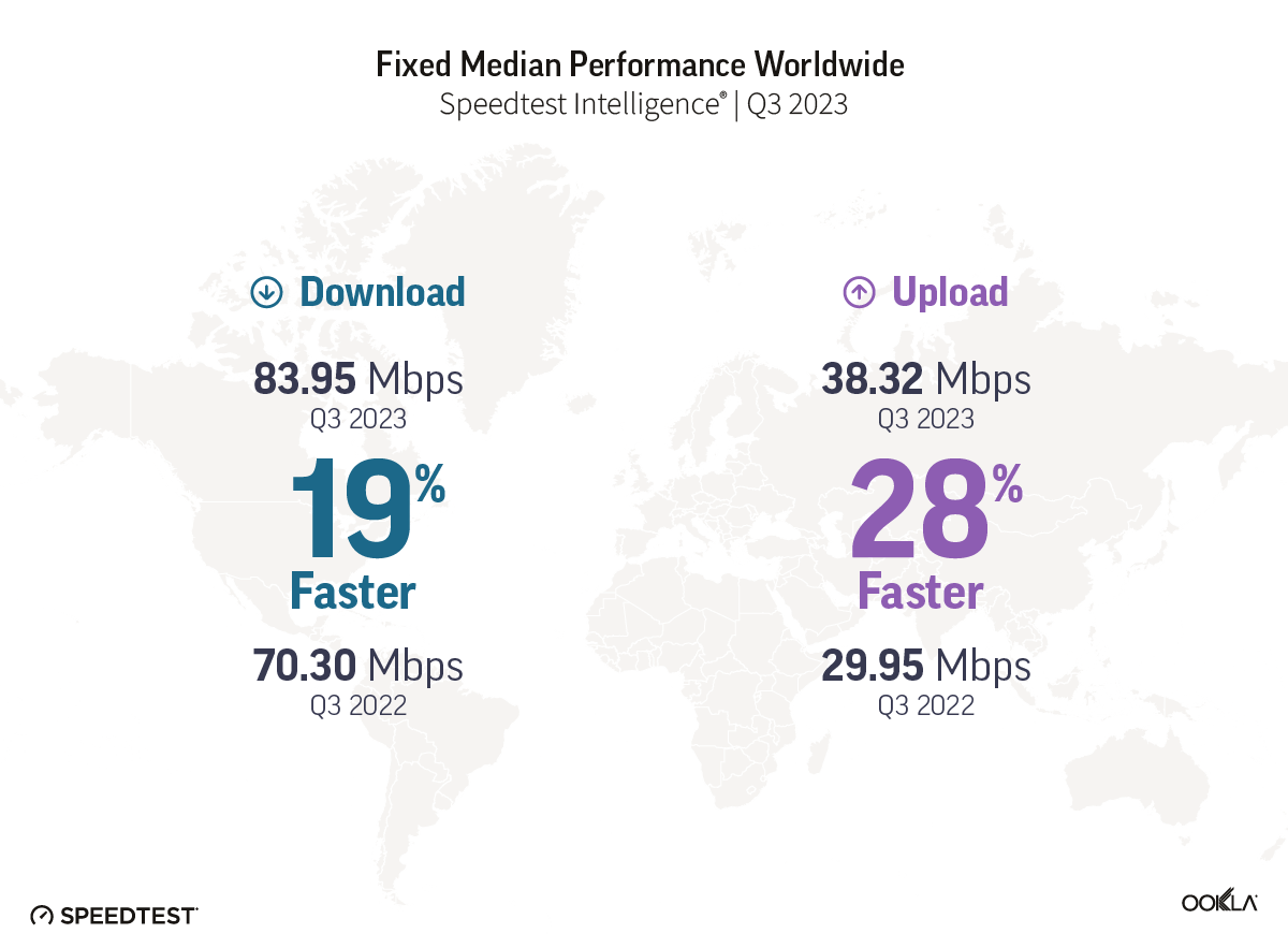 - Fixed Networks Advancements. On a global scale, fixed networks demonstrated significant performance improvement, with a 19% increase in median download speed (83.95 Mbps) and a 28% increase in upload speed (38.32 Mbps) in Q3 2023 compared to the previous year. This highlights the ongoing transition to more advanced broadband technologies, particularly Fiber-to-the-Home (FTTH).