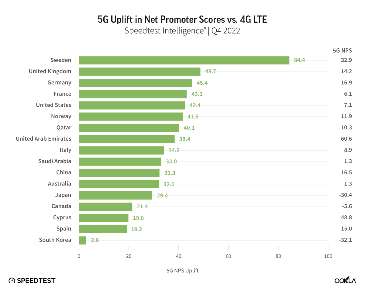 Net Promoter Score (NPS) from Speedtest Intelligence paints a largely positive picture of current 5G networks. NPS is a key performance indicator of customer experience, categorizing users into Detractors (score 0-6), Passives (score 7-8), and Promoters (score 9-10), with the NPS representing the percentage of Promoters minus the percent of Detractors, displayed in the range from -100 to 100. Across the markets we analyzed, 5G users on average rated their network operator with NPS scores that were universally higher than those for 4G LTE users. However, consumer sentiment for users on 5G networks is beginning to shift, with NPS scores falling, coinciding with lower median 5G performance in many of the markets we analyzed.