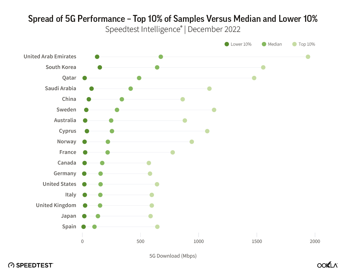 The U.A.E. was the fastest 5G market in our analysis, based on median download performance of 545.53 Mbps in December 2022, followed by South Korea and Qatar. However, the top 10% of users in the U.A.E. recorded speeds of at least 1,266.49 Mbps on average, while the lowest 10% of users experienced speeds of 127.52 Mbps or slower on average. At the other end of the scale, Spain recorded a median 5G speed of 94.14 Mbps, but also demonstrated wide variance between the top 10% of samples at 537.95 Mbps or faster and the lowest 10% with 10.67 Mbps or less.
